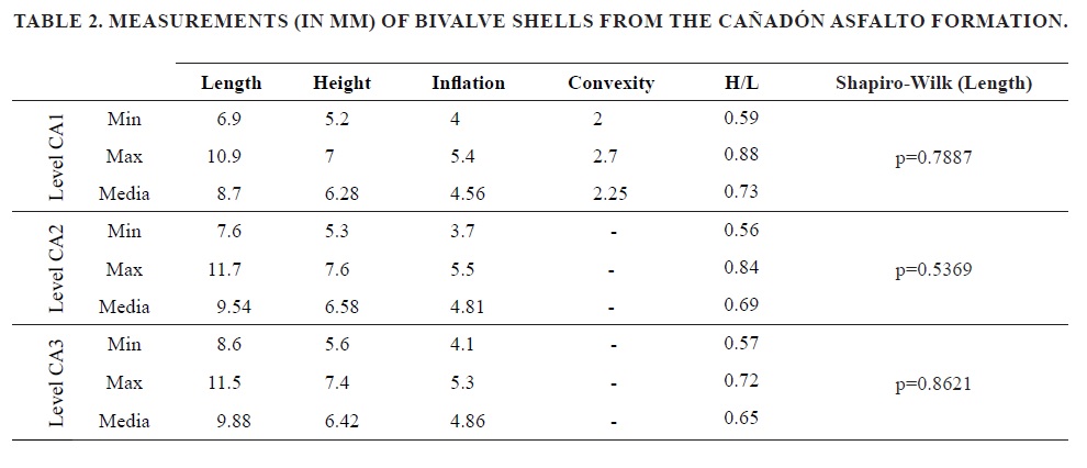Thirty specimens were analyzed in CA1 and CA2 levels, and nine specimens in CA3 due to the bad preservation, which prevents recognizing outlines. In table 2 and figure 4 the differences and similarities among the assemblages of the three levels are shown (supplementary data, Appendix 1). The smallest specimen is 6.9 mm long and 5.4 mm high and the larger specimen is 11.7 mm long and 6.5 mm high. We calculated the Shapiro-Wilk normality test for length in each bivalve levels (Table 2), and this analysis evidence that the three levels have a normal distribution (p>0.05). The size-frequency histogram based on length exhibits a mode at 8.5-9 mm in CA1 and 9.5-10 mm in CA2, while the two peaks at CA3 level is unreliable due to the low number of individuals (Fig. 4A-C). The size-frequency histogram based on height exhibits a mode at 6-6.5 mm in CA1, 6-7 mm in CA2, and 6-6.5 mm in CA3 (Fig. 4D-F).