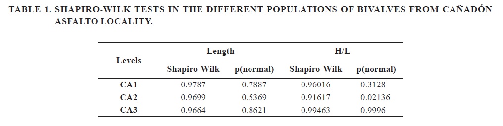 1. Normality tests were applied regarding length and height of the bivalves from each level.
