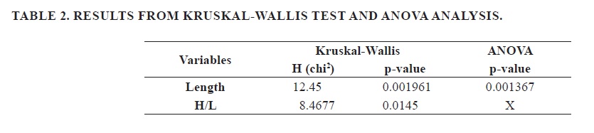 2. We compared length and height between levels through the Kruskal-Wallis test and ANOVA. Kruskal-Wallis results show that there is a significant difference between sample length medians and H/L relationship (p >0.05). ANOVA results indicate the same results of length medians relationship (Table 2).