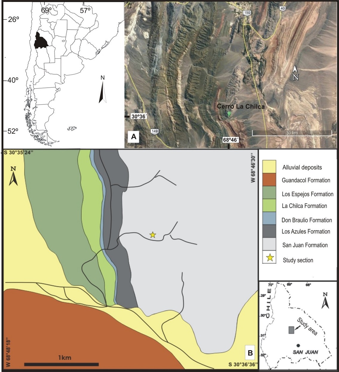 Keller et al. (1994) redefined the lower and middle parts of the San Juan Formation at La Silla section (Central Precordillera) and the upper part at the Cerro La Chilca section. After that, the carbonate and mixed carbonate facies in the San Juan Formation were recognized in several sections by Cañas (1999), Keller (1999), Mestre (2014) and Soria et al. (2017), among others.