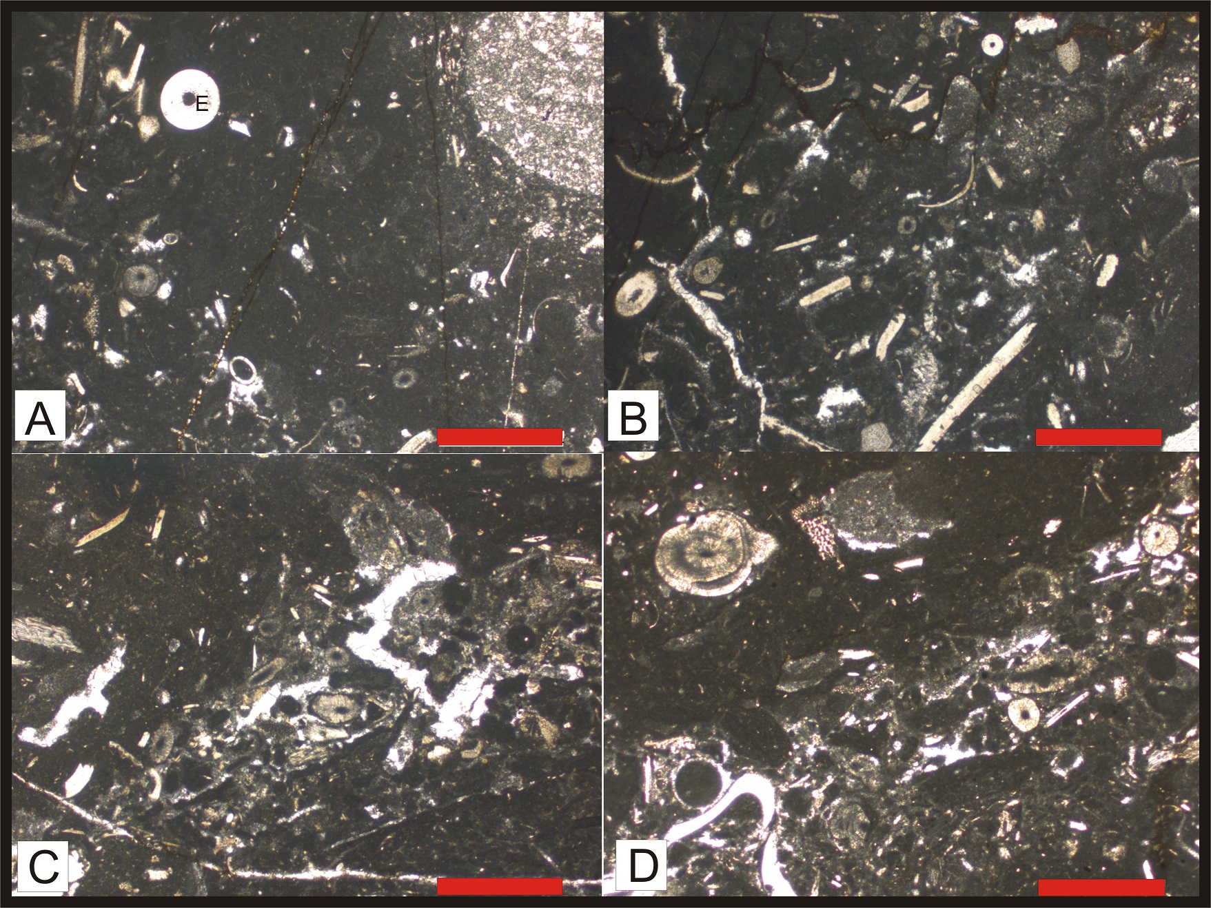 This study is based on laboratory analyses of thin sections. All samples are limestone collected from the San Juan Formation in the Cerro La Chilca section (Fig. 3). Seven thin sections were made in order to identify fossils and analyze the distribution of the microfacies components in the Micropaleontology Laboratory of the Instituto de Investigaciones Mineras (IIM). A petrological investigation of the thin sections was performed using Leica DM2700 microscopes and Lanset binocular microscopes.