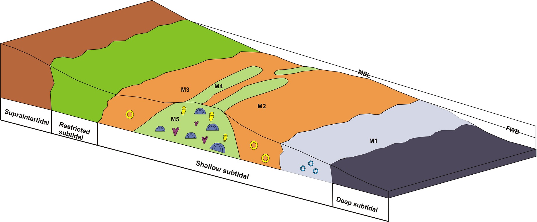Fig. 11. Carbonate platform depositional model for the San Juan Formation in the study area. The platform displays a gentle transition from shallow to deeper depositional environments. The subdivision of the carbonate platform is based on Pomar (2001). FWB: fair-weather wave base; MSL: medium sea level; M1: Burrowed bioclastic wackestone; M2: Peloidal intraclastic packstone-grainstone; M3: Intraclastic floatstone; M4: Intraclasticwackestone-packstone; M5: Bioclastic boundstone; white circle: calcitarch type-III; grey circle: calcitarch type-0.