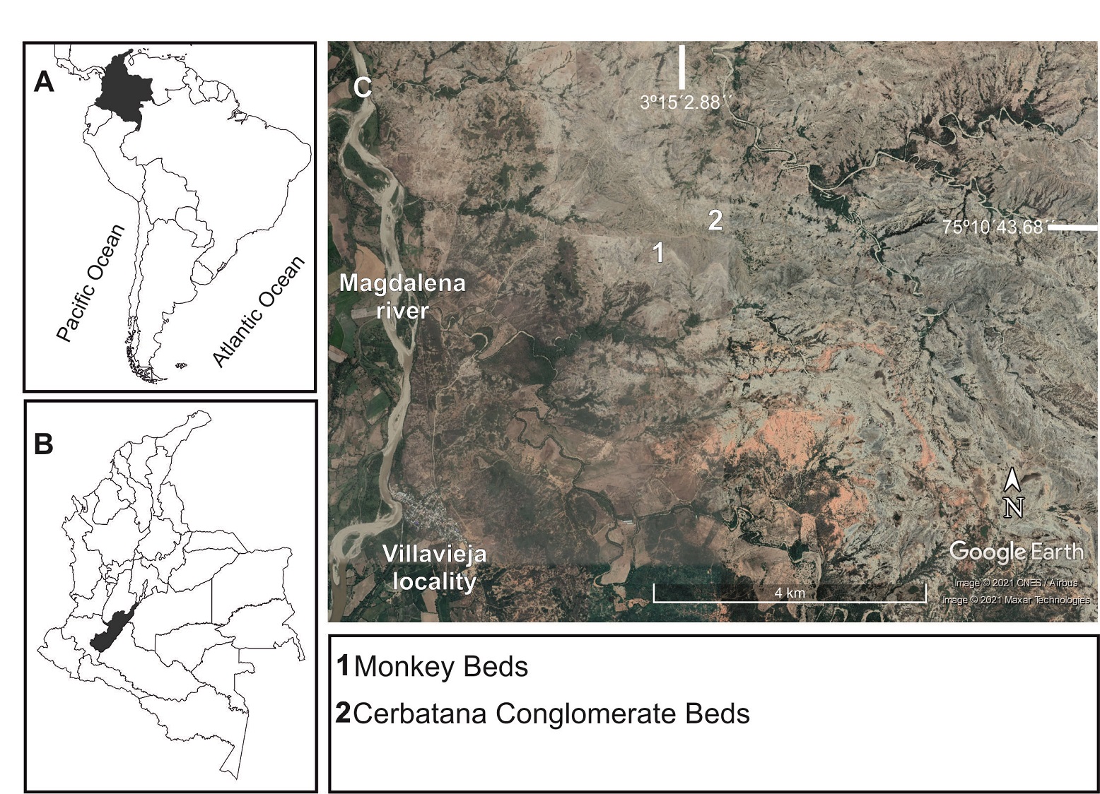 The Honda Group, represented by the La Victoria and Villavieja formations, is located in the Magdalena Valley of central Colombia and includes several fossiliferous localities (e.g., San Francisco St. Beds, El Cardon Red Beds; Madden et al., 1997; Catena and Croft, 2020). The outcrops of the Honda Group have provided a rich Miocene vertebrate fauna, including fishes, reptiles, amphibians, birds, and mammals (Kay and Madden, 1997), which was the base for the recognition of the Laventan South American Land Mammal Age (SALMA) (see Madden et al., 1997). Based on 40Ar/39Ar radiometric dating (Guerrero, 1997), the age of the Honda Group ranges from ~13.5 to 11.5 Ma (Serravallian).