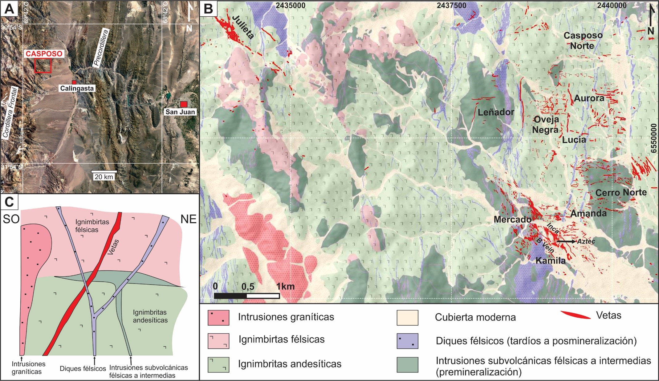 El distrito Casposo se encuentra ubicado en la cordillera Frontal, en el centro-oeste de la provincia de San Juan, a ~200 km al NO de la ciudad de San Juan, Argentina (Fig. 1A). El distrito se caracteriza por la presencia de un extenso sistema de vetas epitermales de baja sulfuración, con anomalías de Au-Ag (Cu-Pb-Zn-Mo), hospedado en rocas volcánicas del Grupo Choiyoi afectadas por múltiples estructuras con diferentes orientaciones (Sotarello et al., 2002). Regionalmente, el tren estructural que controla la mineralización de Au-Ag tiene una dirección predominante NO-SE (Fig. 1B). En él se minaron tres sectores: Mercado, Kamila y Julieta, los que concentran los mayores recursos del depósito. Julieta se encuentra a ~5 km al NO de Mercado y Kamila, y se ubica a alturas medias de 3.000 a 3.500 m s.n.m. (Fig. 1B).