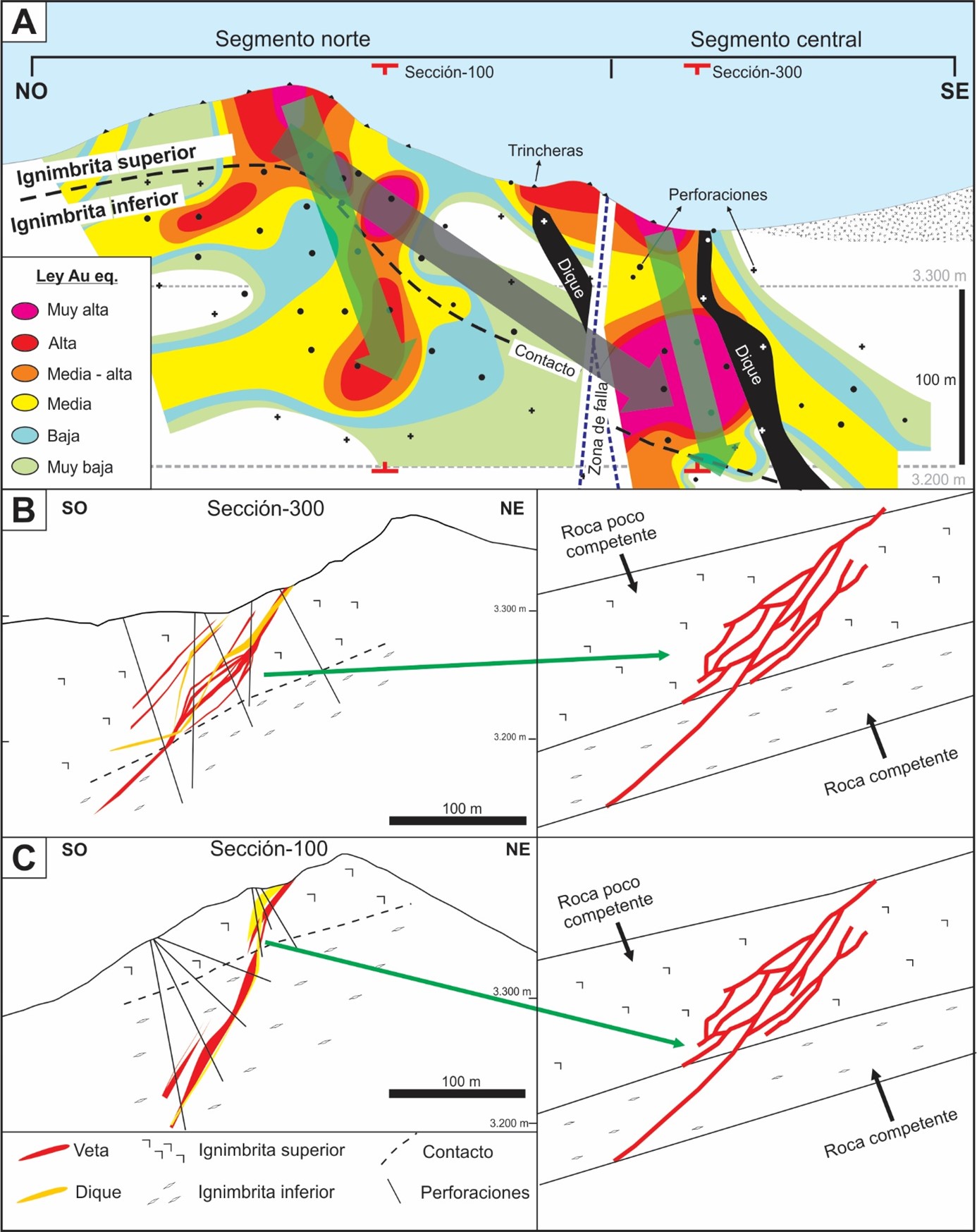 FIG. 8. A. Sección longitudinal donde se aprecia la distribución del Au dentro de los principales clavos mineralizados. B. Sección transversal -300, donde se observa una inflexión en la vertical. C. Sección transversal -100 (Modificado de Jovic et al., 2018). A la derecha de B y C se esquematiza un zoom del área de inflexión. Referencias de B en C. Ver A para ubicación de las secciones -300 y -100.