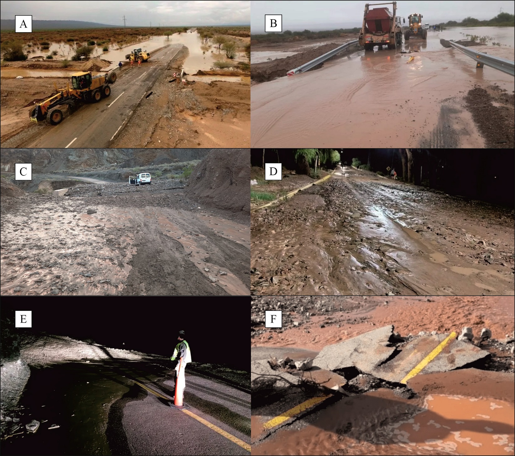 En los últimos años, según periódicos y reportes locales, se han registrado a lo largo de la cuenca del río Jáchal diversas tormentas de carácter torrencial que dieron origen a eventos aluvionales que produjeron cortes de rutas (Fig. 1), caídas de árboles y destrucción de viviendas y vehículos en los departamentos de Iglesia y Jáchal. Estas tormentas torrenciales ocurrieron principalmente entre los meses de octubre a marzo. Según los reportes publicados en periódicos locales, las tasas de precipitación que ocasionaron estos eventos variaron desde los 17 a 23,5 mm/día. Existe también registro de procesos aluvionales generados a partir de valores menores de precipitación diaria, lo que sucede en casos de eventos de lluvias consecutivas (Diario de Cuyo, 20175, 20186, 20217, 20228; Diario Huarpe, 20229; Diario Móvil, 202310; Radio UNSJ, 2023)11. Bereciartua et al. (2009) registraron, en la cuenca del río Jáchal para el periodo 1960-2009, un aumento de las crecidas del 24% con caudales de hasta 214 m3/s.