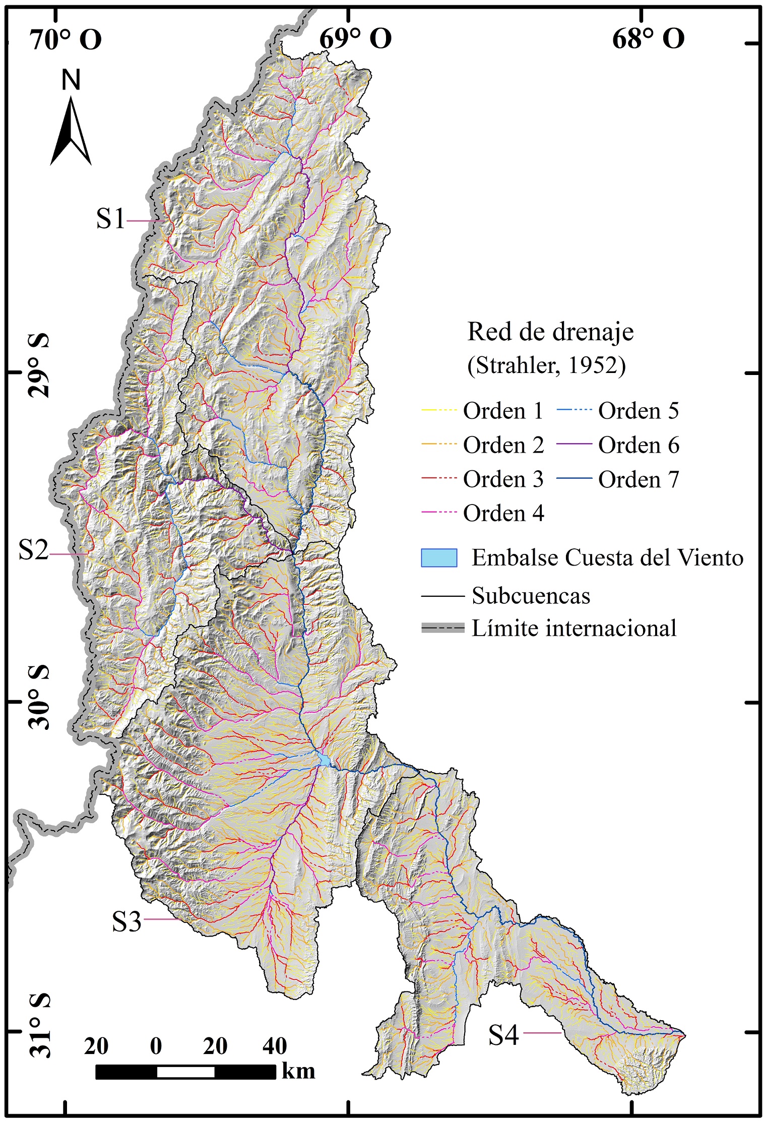 La cuenca del río Jáchal está ubicada en el centro-norte de la provincia de San Juan y oeste de la provincia de La Rioja (Fig. 2), sector andino del oeste de Argentina, entre las latitudes 28°0’ y 31°9’ S y las longitudes 70°1’ y 67°5’ O. La cuenca forma parte del espacio geográfico llamado Sistema Desaguadero (Damiani, 2016). Corresponde a una cuenca de 7o orden (Fig. 3) según la clasificación de Strahler (1952b), con una superficie de 28.991,30 km2 y un perímetro de 2.395,96 km . Debido al carácter regional del estudio, la cuenca del río Jáchal se dividió en cuatro subcuencas denominadas S1, S2, S3 y S4 (Figs. 2 y 3).