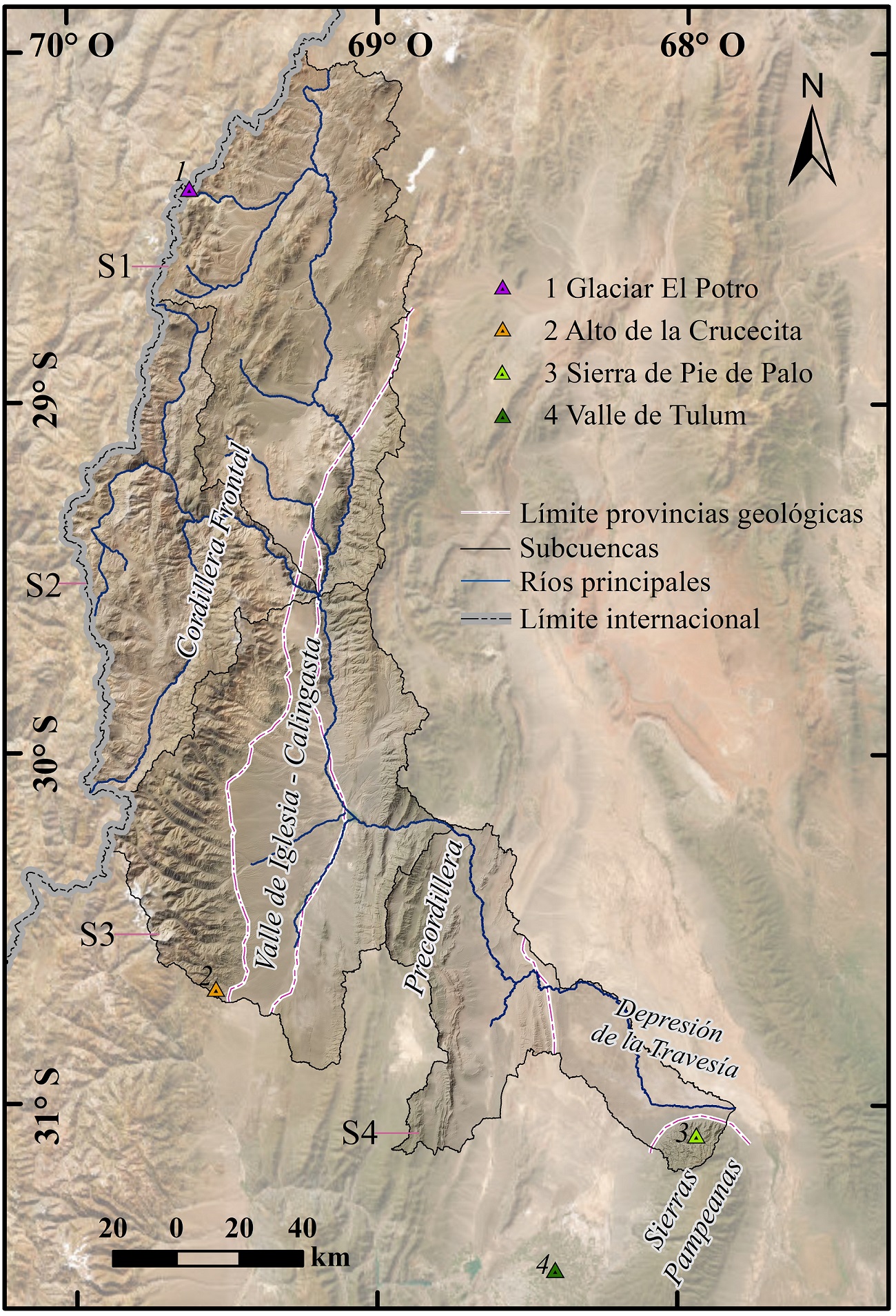 La cuenca del río Jáchal se desarrolla de noroeste a sureste sobre las unidades morfoestructurales de la Cordillera Frontal, Precordillera Occidental, Precordillera Central y Precordillera Oriental y parte de las Sierras Pampeanas (extremo norte de la Sierra de Pie de Palo) (Fig. 4). Los límites entre estas unidades morfoestructurales están representados por valles intermontanos de orientación norte-sur y de origen tectónico (Fig. 4). En particular, la cuenca estudiada tiene una pendiente que disminuye alrededor de 6 km hacia el sureste, desde la Cordillera Frontal (altitud máxima de 6.449 m s.n.m.) hasta el valle de Tulum (640 m s.n.m. en promedio). La morfología del área de estudio se caracteriza por cordones montañosos y serranías en las unidades Cordillera Frontal, Precordillera y Sierras Pampeanas, y por geoformas bajas, tales como piedemonte y playas o barreales, en el valle de Iglesia-Calingasta y en la depresión de la Travesía (Fig. 4).