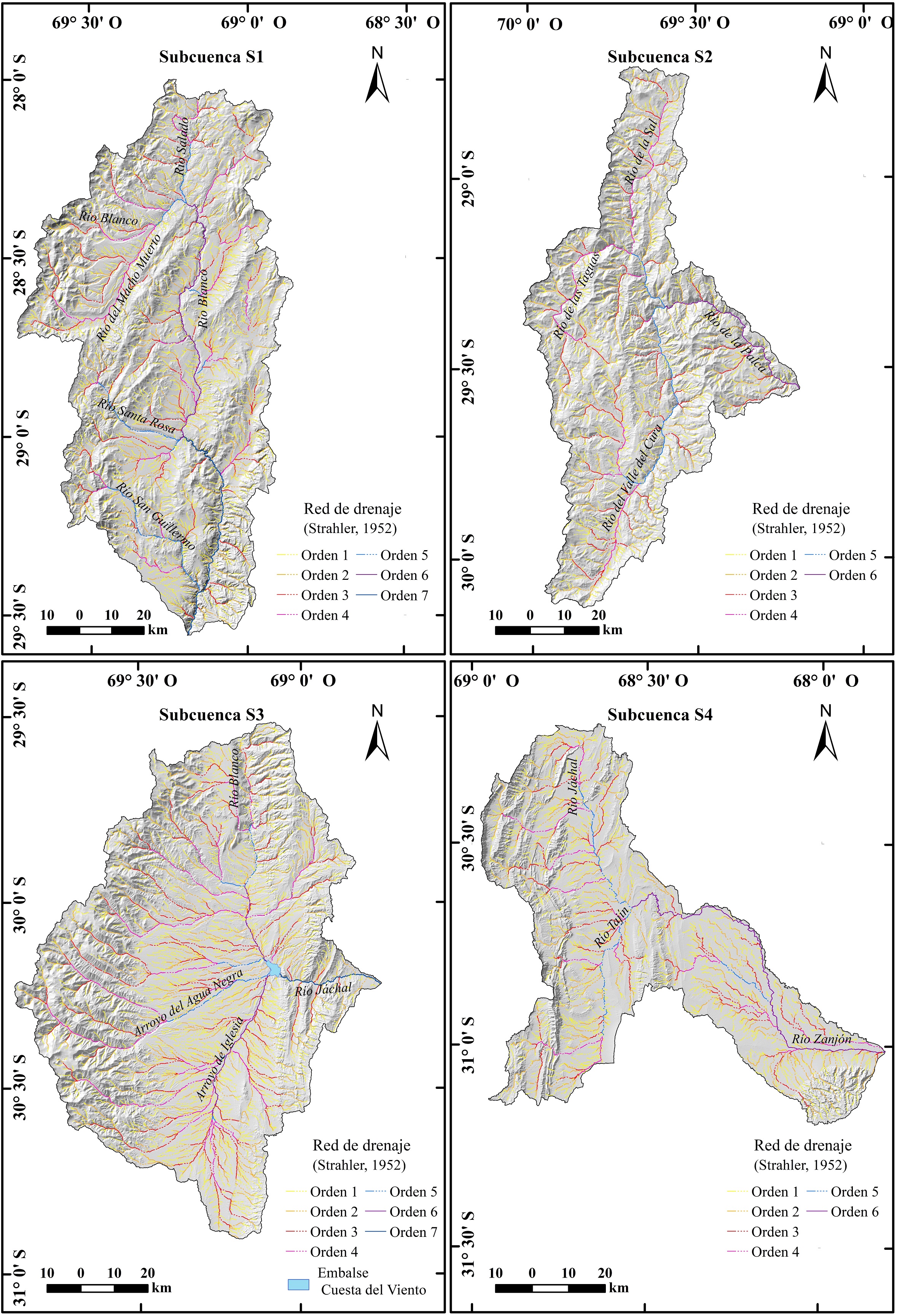 FIG. 5. Hidrografía de las subcuencas del río Jáchal. Se muestra la red de drenaje según Strahler (1952b) y sus ríos principales.