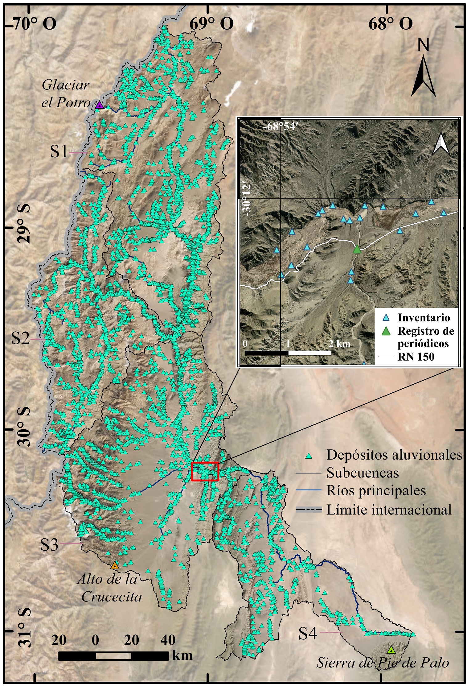 El inventario de aluviones se realizó mediante la identificación manual de los mismos a partir de imágenes satelitales en la plataforma Google Earth. Para cada depósito aluvional identificado se seleccionó un punto ubicado en su centro, mientras para los depósitos afectados por acción fluvial y/o antrópica igualmente se seleccionaron puntos en ellos a modo de obtener un inventario completo (Fig. 6). Por lo tanto, el inventario solo toma en cuenta un punto de una parte del depósito. Se optó esta metodología principalmente por el carácter regional del estudio. De esta manera se identificaron 4.175 depósitos aluvionales (Fig. 6).