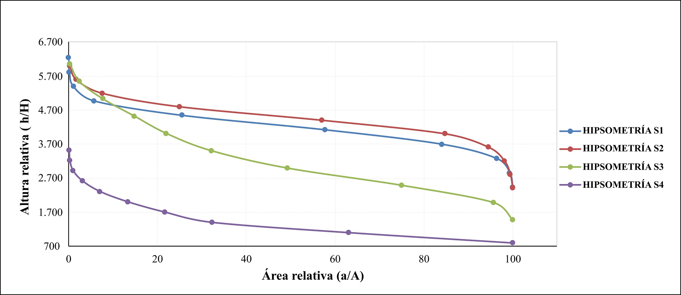 Las curvas hipsométricas describen el porcentaje de área de una cuenca que existe por debajo o por encima de una cota determinada (Strahler, 1952a; Keller y Pinter, 1996), las mismas proveen información sobre la evolución de las cuencas de drenaje (Quezada et al., 2010).