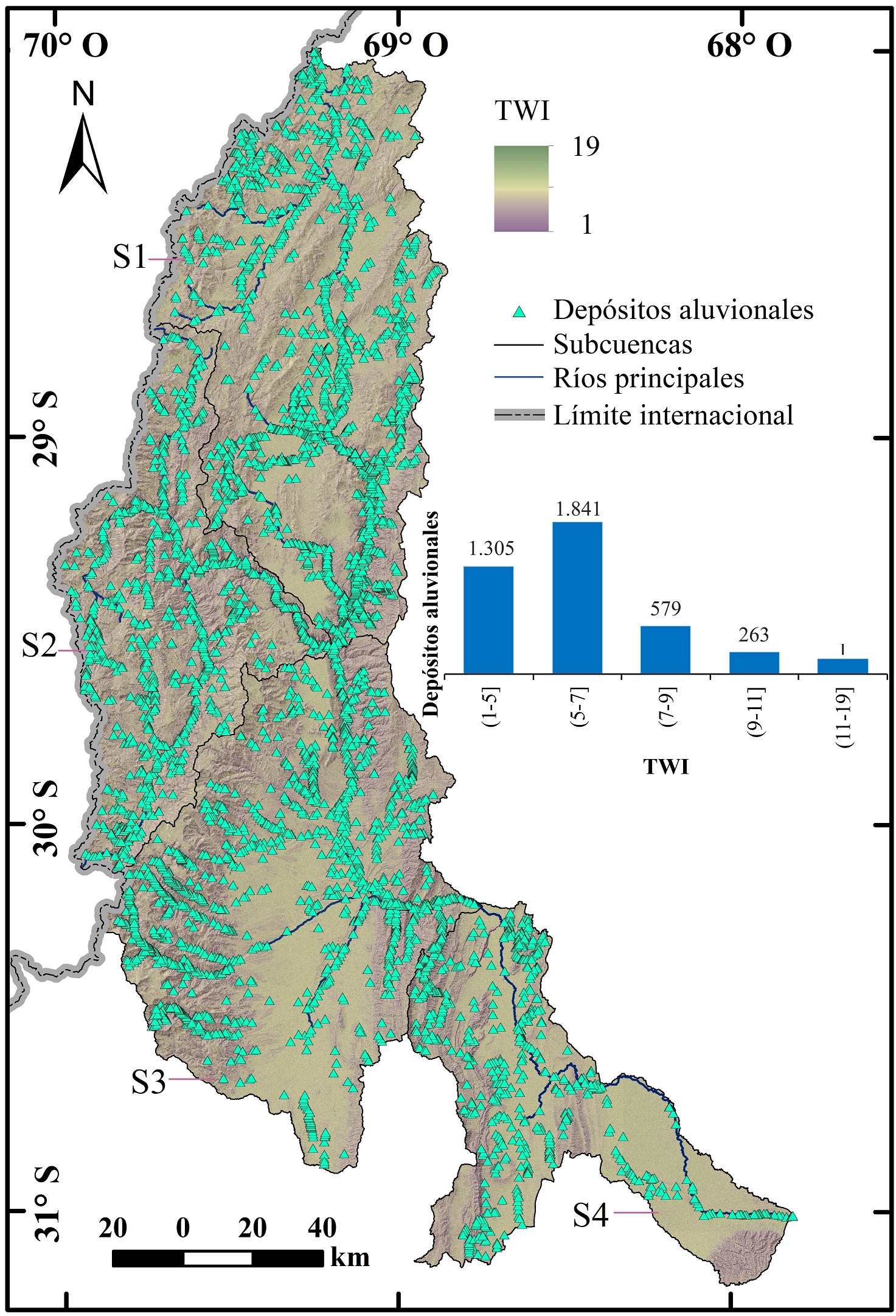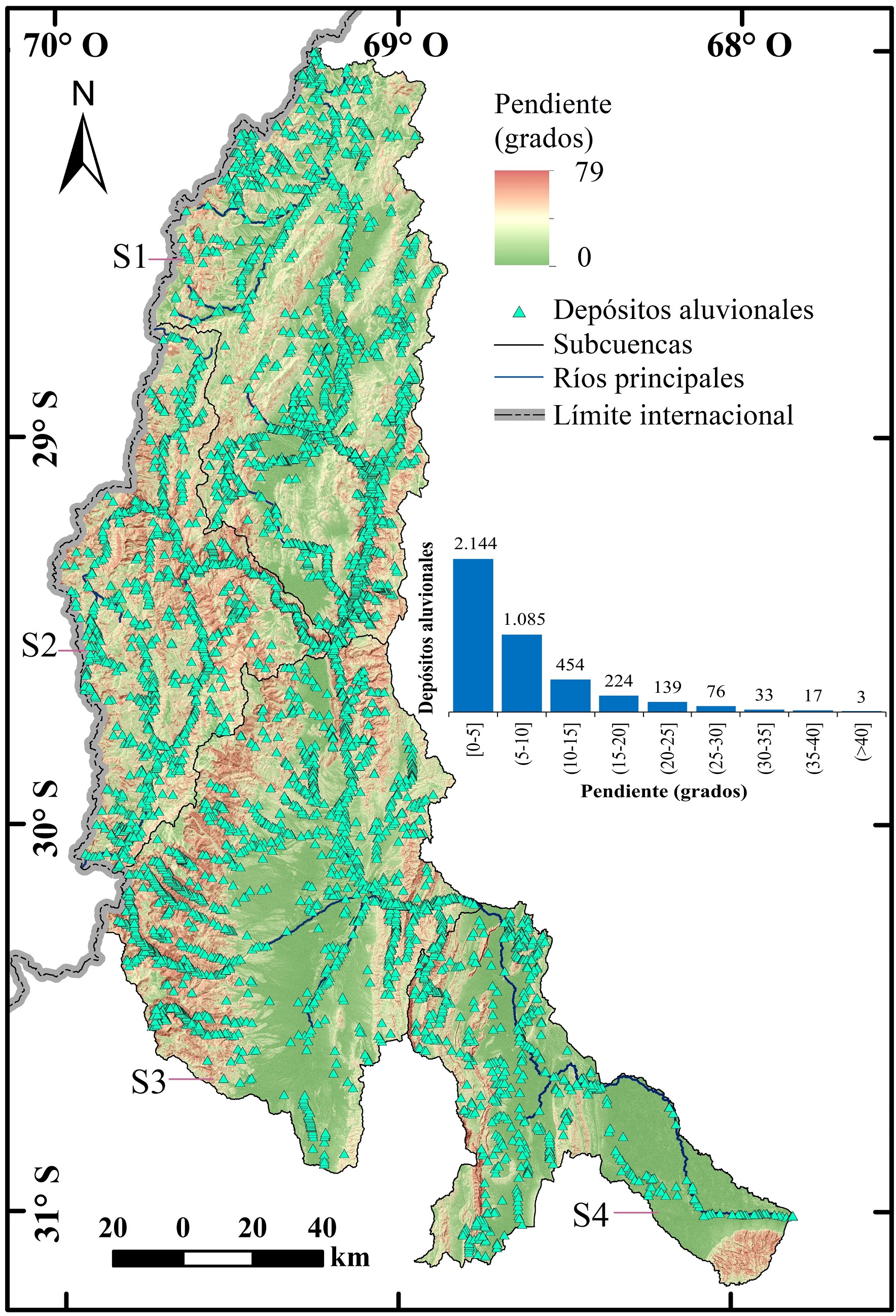 La cuenca del río Jáchal presenta una elevación máxima de 6.449 m s.n.m. y una elevación mínima de 650 m s.n.m. La elevación máxima se encuentra en la subcuenca S1 y la mínima en la subcuenca S4 (Fig. 8). La mayor concentración de depósitos aluvionales (3.072, ~73,5% del total) se distribuye entre los 2.389 y los 4.544 m s.n.m. (Fig. 8). Estos se encuentran en su mayoría asociados a pies de laderas.