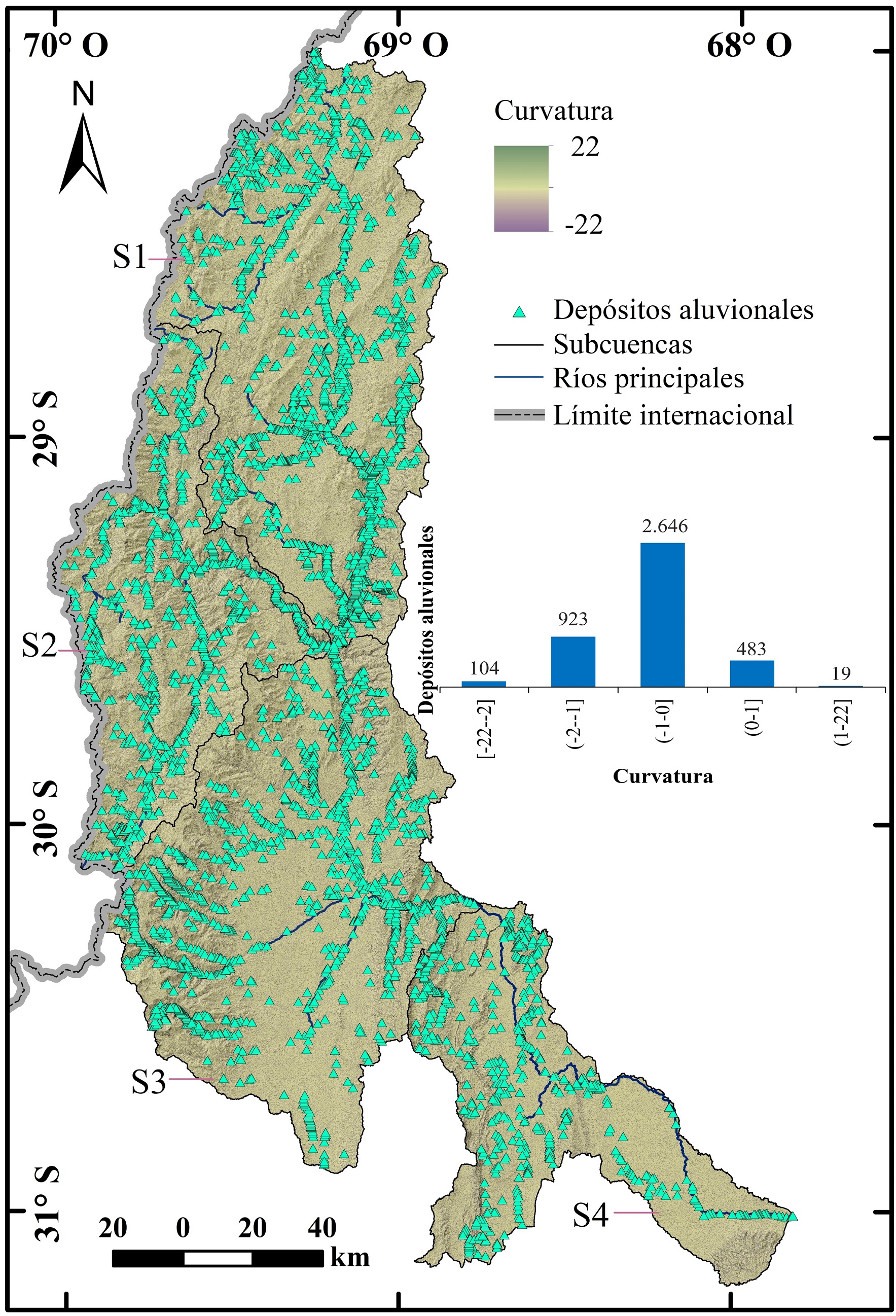 El valor de la curvatura de laderas se puede utilizar para detectar patrones de erosión del suelo (Moore et al., 1991). La cuenca presenta valores de curvatura máximos de 22 (condiciones de erosión en áreas convexas) y mínimos de -22 (condiciones de depositación y convergencia del flujo en áreas cóncavas). Valores bajos de curvatura (-7 a -2) sugieren que en zonas de cauces hay un predominio de áreas convergentes y zonas de depositación, lo cual coincide también con una disminución de pendiente. En tanto, en zonas de elevada pendiente, como por ejemplo en laderas y lechos de ríos montañosos, se observan valores de curvatura interpretados como correspondientes a áreas de aceleración de flujos, donde predominan procesos erosivos (Fig. 11). Escarpes y divisorias de aguas muestran valores de curvatura positivos, lo cual indica divergencia de flujo. Valores de curvatura cercanos a cero corresponden a morfologías relativamente planas e infraestructuras del tipo dique. Para la gran mayoría de los depósitos aluvionales identificados en la cuenca del río Jáchal (4.052, ~97% del total), la curvatura se concentra en valores entre -2 y 1 (Fig. 11), lo cual indica un predominio de depósitos en zonas planas y/o convergentes.