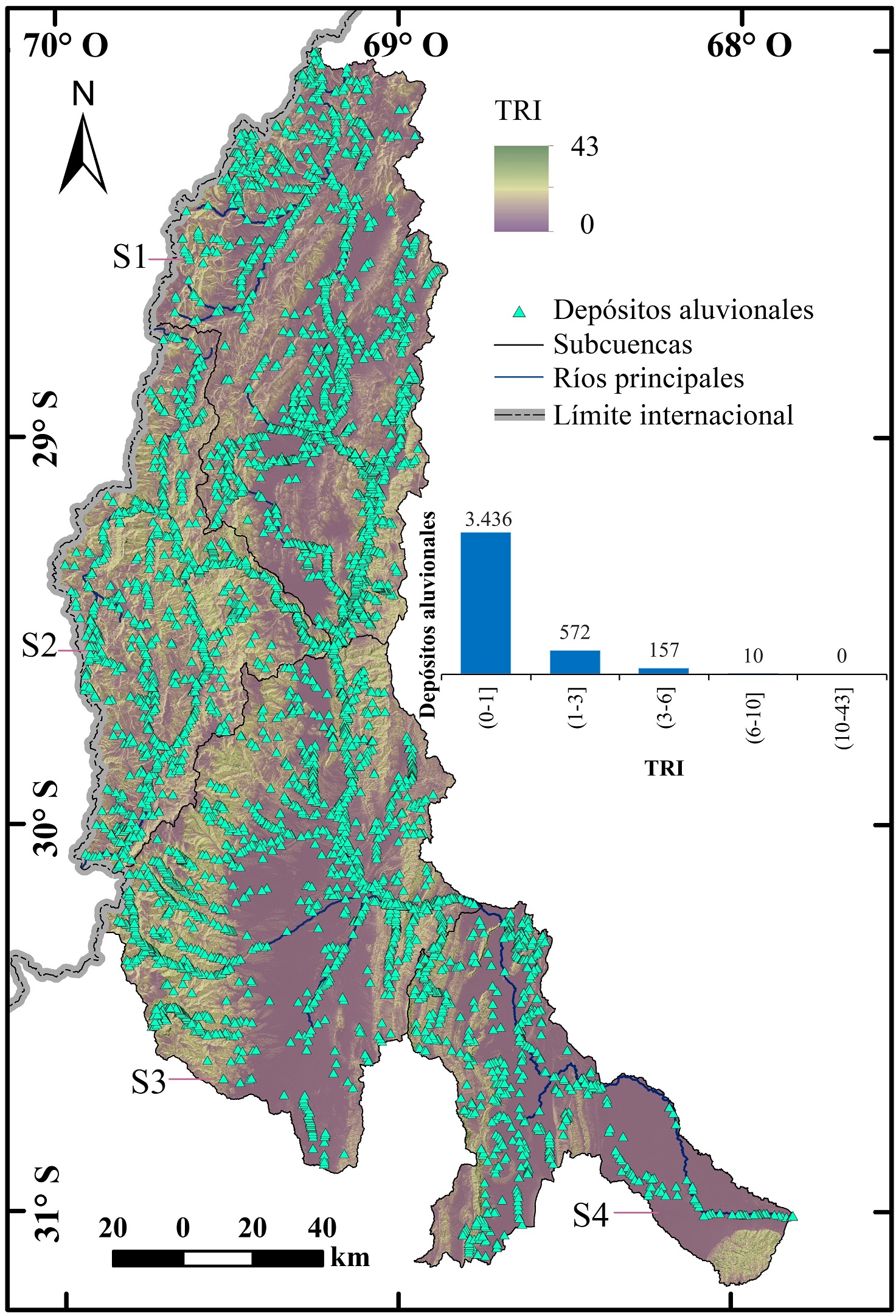 Los valores máximos del índice de rugosidad del terreno (TRI; Fig. 13) coinciden con los cordones montañosos, sierras y escarpas, los cuales se asocian a pendientes muy elevadas y por ende a zonas más propensas a la generación de aluviones. Una vez generados, estos aluviones discurren con un gran potencial erosivo, y se depositan en zonas con rugosidades bajas. El predominio de depósitos aluvionales se da en terrenos con muy baja rugosidad, mayormente con valores de TRI entre 0 y 3 (Fig. 13).