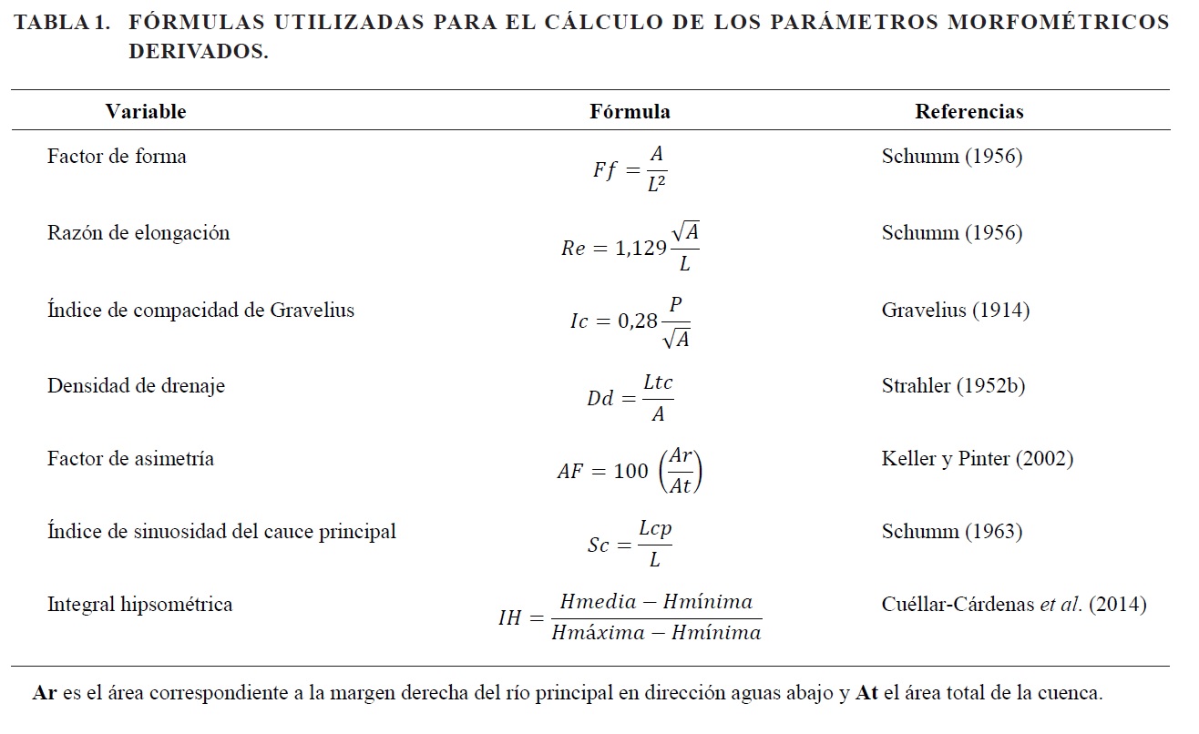 Los parámetros morfométricos básicos calculados fueron los siguientes: área (A), perímetro (P), longitud (L), ancho (W), orden de la cuenca (On), orden de curso (O), altura máxima (H), altura mínima (h), longitud total de cauces (Ltc) y longitud del cauce principal (Lcp). Los parámetros L y Lcp fueron obtenidos según los criterios de Schumm (1956). A partir de estos parámetros morfométricos básicos se calcularon los parámetros morfométricos derivados (Tabla 1): factor de forma (Ff), razón de elongación (Re), índice de compacidad de Gravelius (Ic), densidad de drenaje (Dd), factor de asimetría (AF), índice de sinuosidad del cauce principal (Sc) e integral hipsométrica (IH).