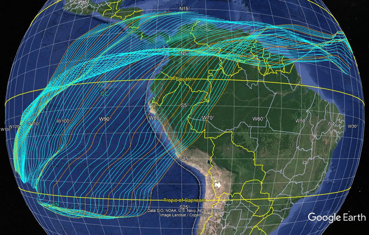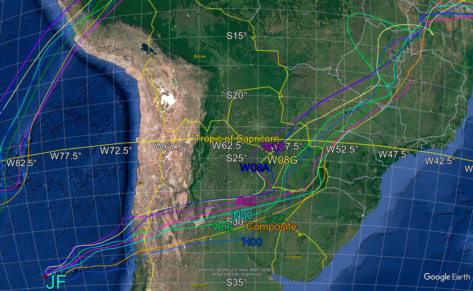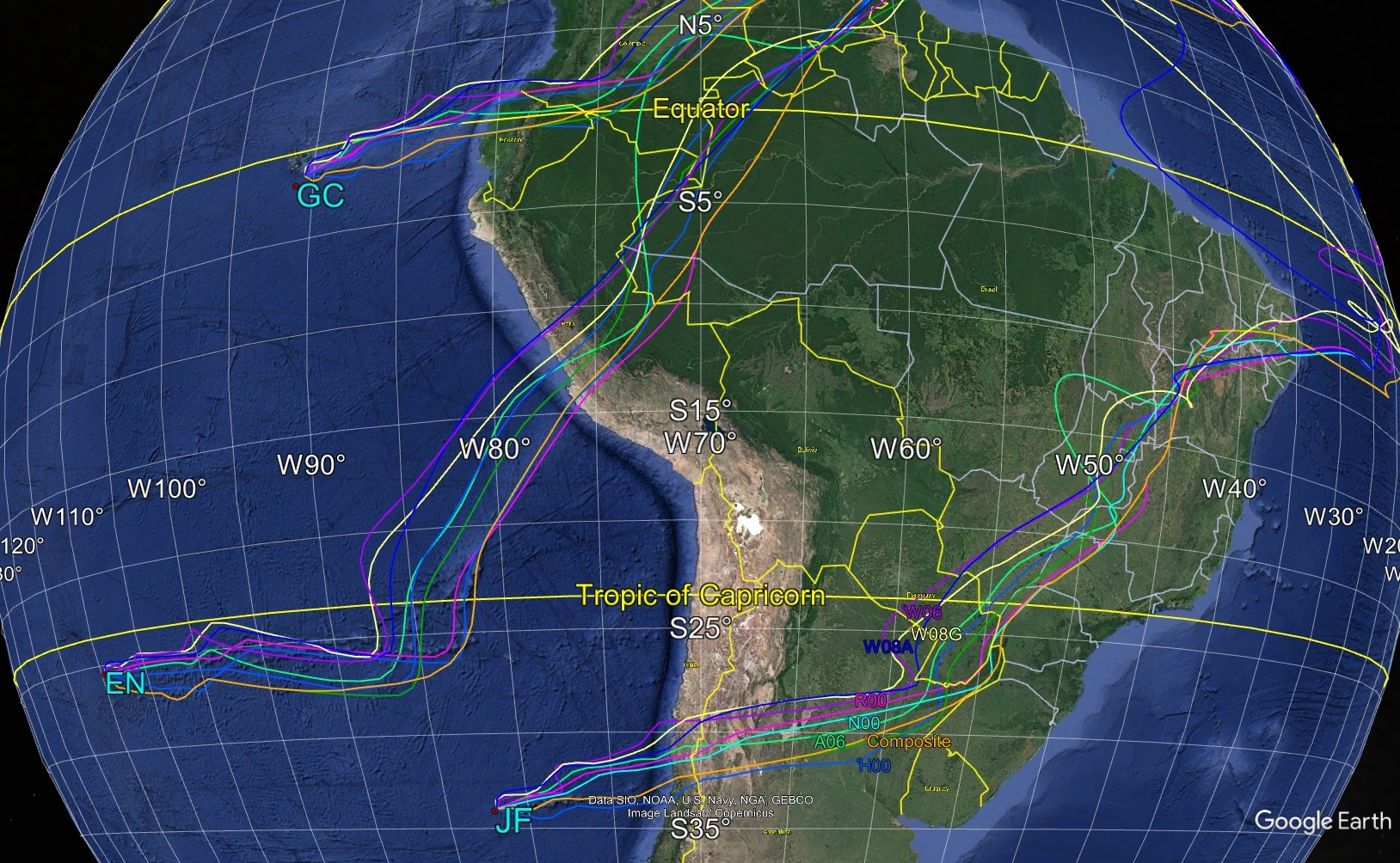 From the composite model, the calculated JF and EN hotspot traces on the Nazca plate were again reconstructed relative to the South American plate back to 80 Ma, at 1 Myr increments(Fig. 3, with 5 Myr increments highlighted). The traces are not conformed to an inferred three-dimensional subduction zone configuration in either map views or graphical sections.