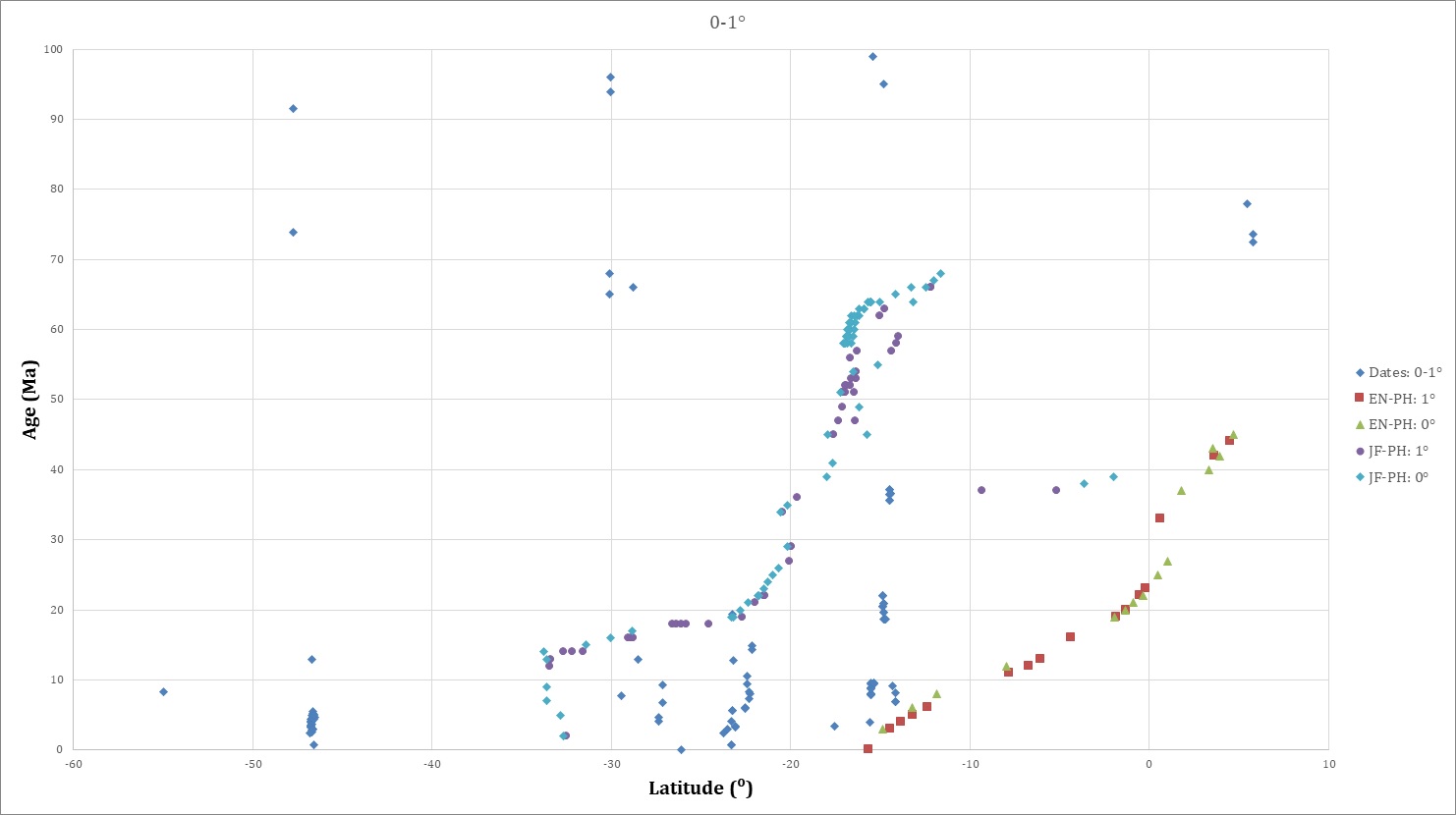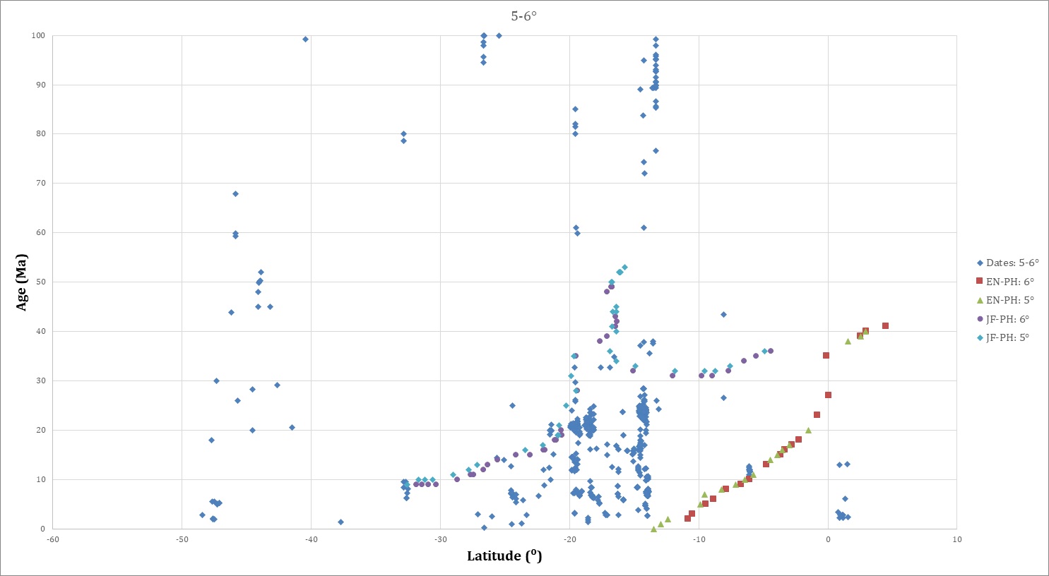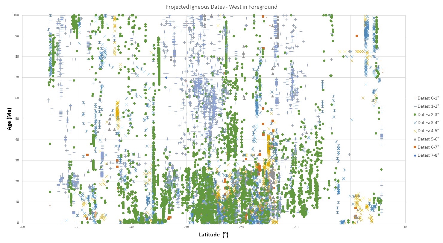 In figure 4, all isotopic dates <80 Ma are projected onto a graph of age versus latitude arranged by longitudinal distance from the trench. The dates farthest from the trench are progressively “on top” of dates closer to the trench in figure 4A, and viceversa in figure 4B.