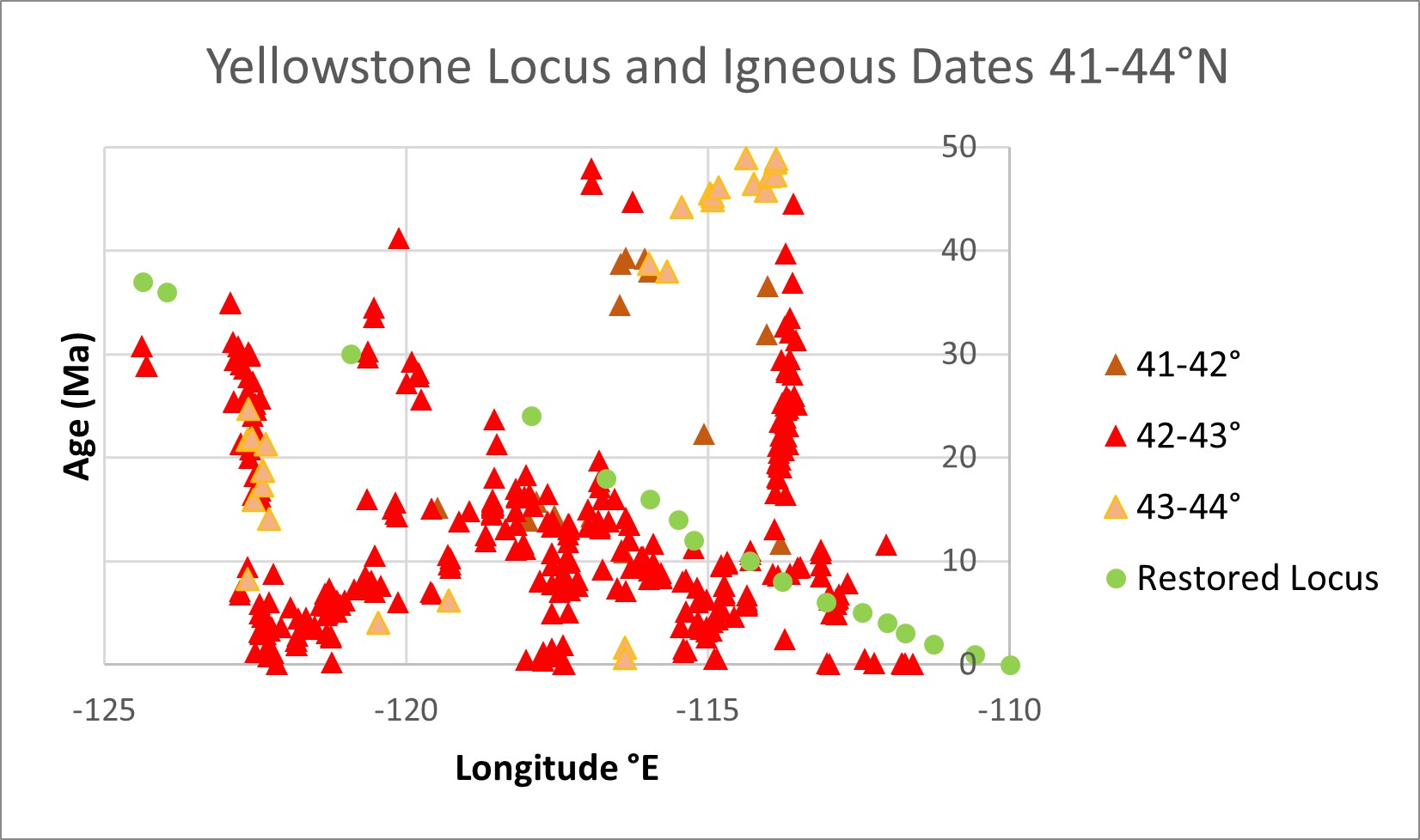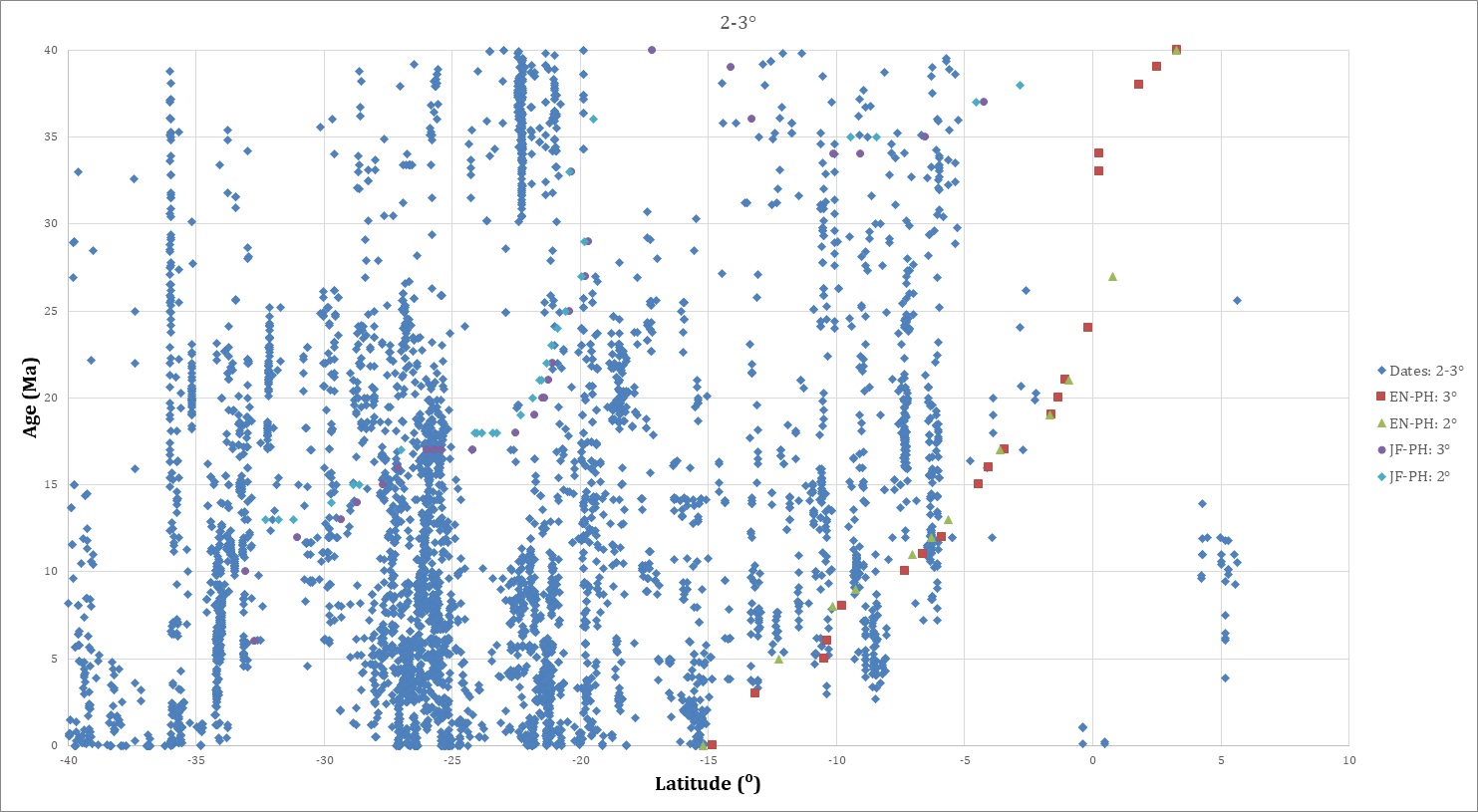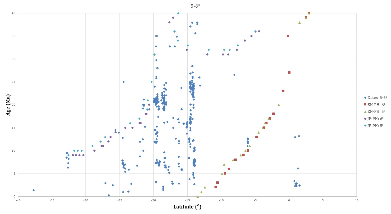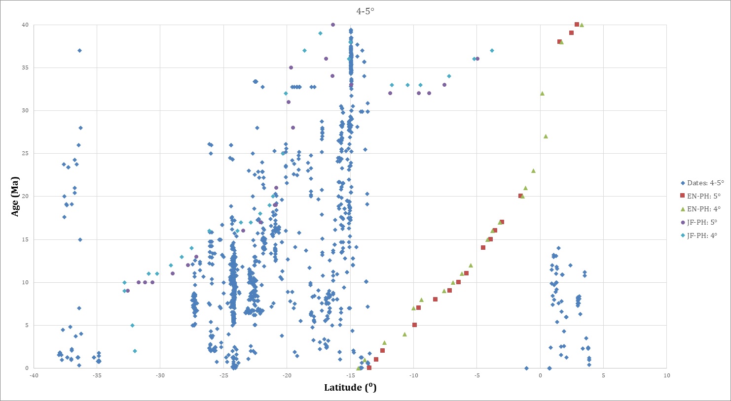 In figure 4, all isotopic dates <80 Ma are projected onto a graph of age versus latitude arranged by longitudinal distance from the trench. The dates farthest from the trench are progressively “on top” of dates closer to the trench in figure 4A, and viceversa in figure 4B.