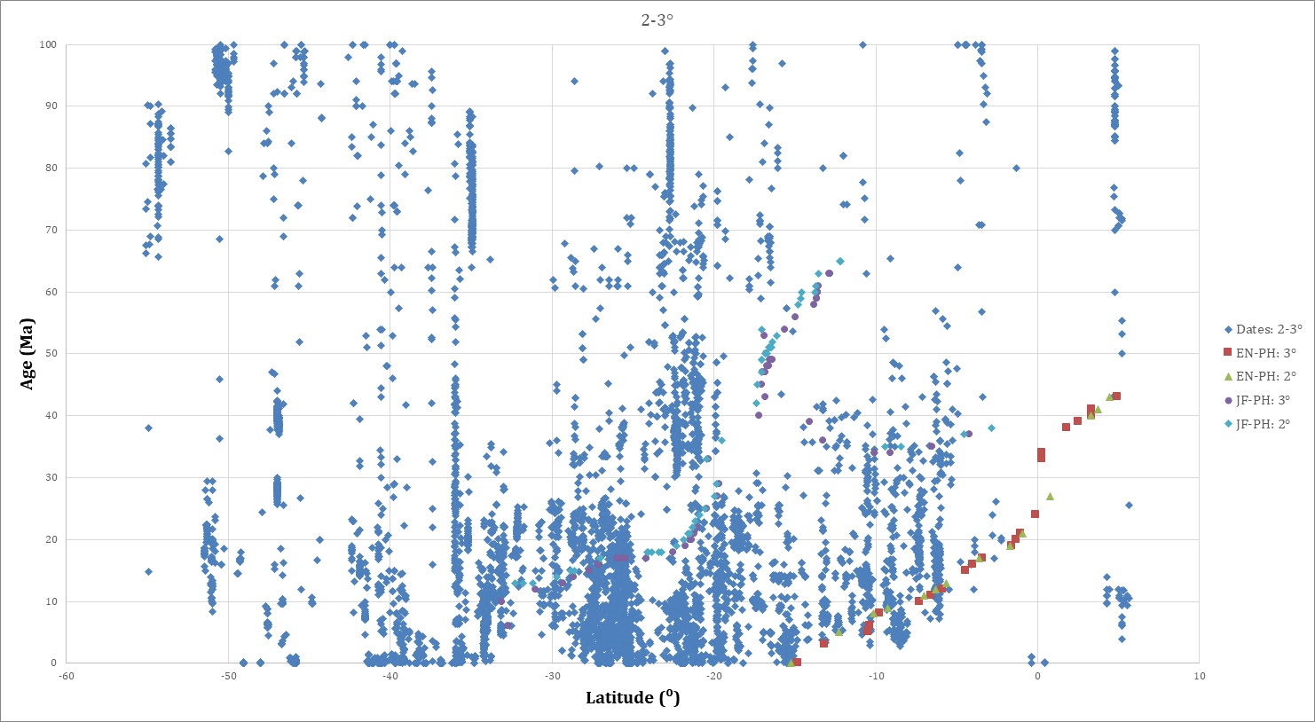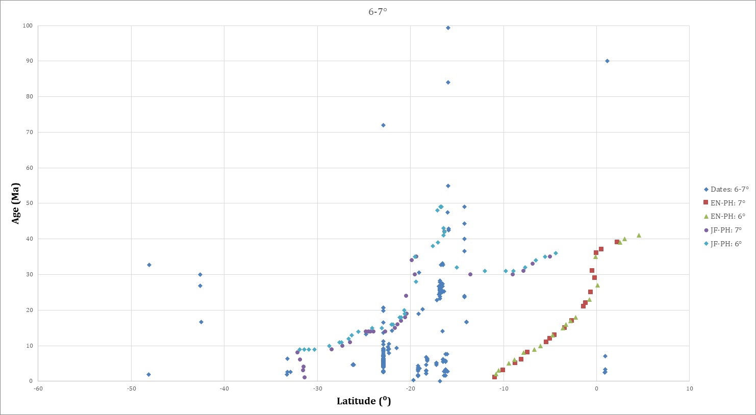 The author updated and expanded the compilation of radiometric dates from Andean igneous rocks providing for comparison with plate-to-plate and plate-hotspot reconstructions. The dataset, which incorporates previous regional compilations as well as numerous original publications, is particularly focused on the Andean crest from northern Peru to southern Chile and along the foreland from Peru through Bolivia and Argentina. Maps at 10 Myr intervals, 0-80 Ma, are provided in the Supplementary Data, along with a Supplementary File for display in Google Earth. For this study, sections parallel with the oceanic trench display the radiometric data projected normal to the sections. Figure 4 portrays the dates in two stacked views, in age versus latitude, for 0-100 Ma and 10° N to 60° S. Figures 5 and 6 are graphs of age versus latitude for 1° longitude segments together with reconstructed loci intersections.
