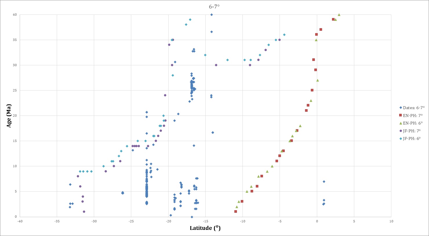 What is the significance of the correlation of isotopic dates and loci intersections of hotspot traces? It is inferred that after passage of the JF trace to the south, magmatism increased and spread farther to the east (e.g., Kay and Coira, 2009). In other words, a southward-shifting, short-lived period of low-angle subduction (depending on the width of the segment, perhaps 2 to 4 Myr in duration between 25 and 15 Ma) interrupted normal subduction and was quickly followed by resumption of, perhaps even increase in magmatism, after passage of the trace (e.g., de Silva and Kay, 2018). Note that the older (>50 Ma) parts of the JF locus intersections lack obvious correspondence with observed isotopic dates (Fig. 5); this is also the least certain part of the Pacific-hotspot motion (Wessel and Kroenke, 2008) due to the scarcity of dates from the Pacific traces older than 80 Ma, although Gaastra et al. (2022) have shown that a fixed hotspot model can fit available data for the past 80 Myr. For the younger parts of both hotspot traces, especially <40 Ma, the projected dates are a bit older than the calculated intersections; because of the two-dimensionality of the graphs, the differences are uncertain. This may be a function of errors in the Pacific-Nazca reconstructions, especially between 10 and 25 Ma, for which magnetic survey coverage is sorely lacking. It is possible that the JF trace encountered the trench several million years earlier than calculated here. Given the sparse magnetic surveys over the Nazca and east-central Pacific plates, and reliance upon assumptions of symmetric spreading based on one-sided reconstructions of the Farallon-Pacific spreading center, there is room for significant variation in the calculated reconstructions (for example, compare the parameters from Rowan and Rowley, 2014, used in this study, with those from Wright et al., 2015). Also, given the oblique encounter of the JF trace with the subduction zone from 25 to 15 Ma, the cessation of trace subduction, as the ridge-subduction intersection migrates southbound, would produce a propagating window with possible “leakage” into the overlying South American plate ahead of the actual deeper trace intersection; that is, possible propagating tears or gaps in the subducting slab accompanying both flanks of the low-angle segment (cf. Báez et al., 2023).