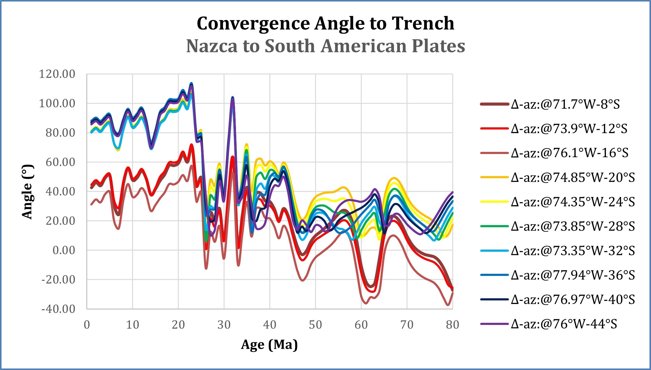 Figure 8 illustrates instantaneous Nazca to South American convergence rates and directions calculated at 1 Myr increments at locations along the Andean trench, via spline interpolation of rotation pseudovectors. The angles are measured clockwise from the trench. Resolution of source data is denser over the past 25 Myr, because of the greater resolution of source plate pairs in the South Atlantic, Southwest Indian, and Southwest Pacific oceans.