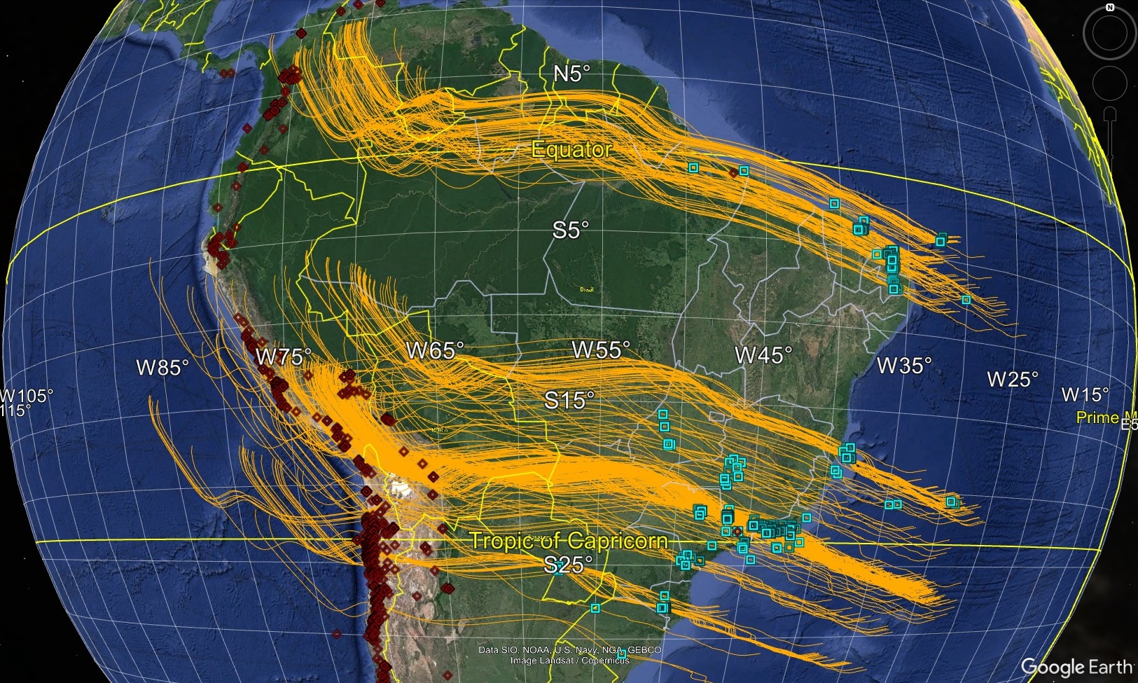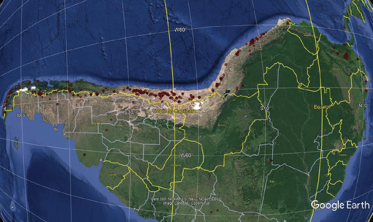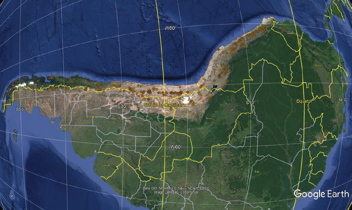 FIG. 13. Full loci of isotopic dates from eastern Brazil and Paraguay (blue squares) backtracked with respect to the Tristan hotspot reference frame using (spline interpolated) parameters of Müller et al. (1993) for 0-130 Ma and Maher et al. (2015) for 130-150 Ma. Also shown are Jurassic and Cretaceous dates (red diamonds) in Colombia, Peru, Bolivia, Argentina, and Chile. (Note how many back-tracked loci come close to the data points in the Andes.) Data points and loci provided in Supplementary File.