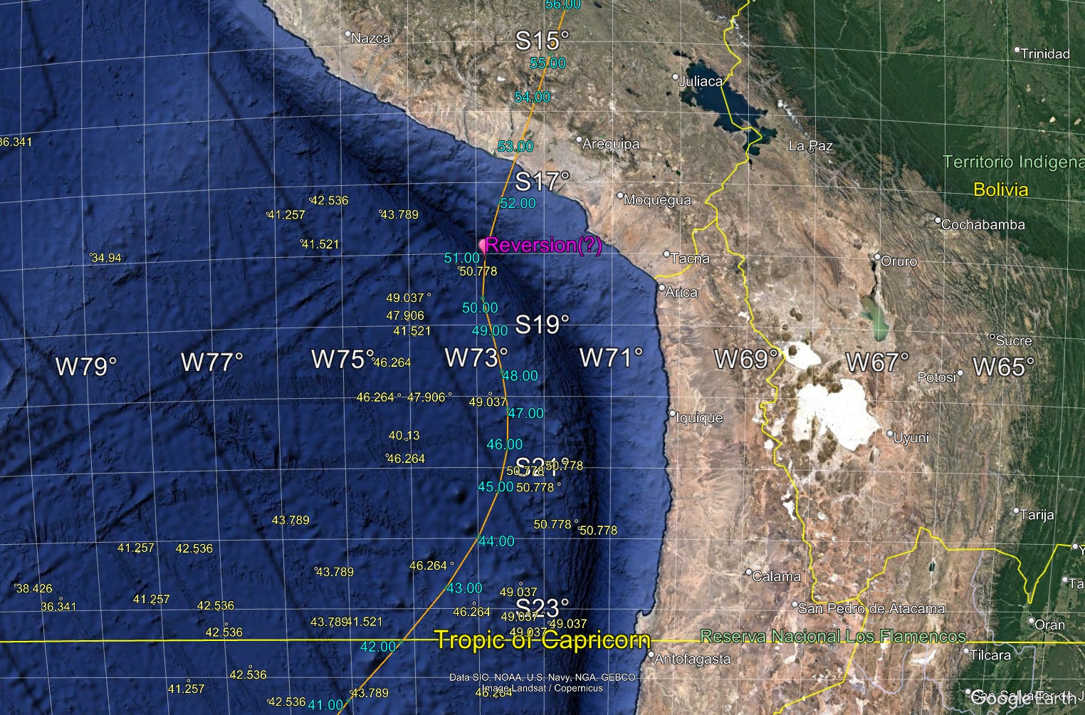 Global reconstructions of the motion of the subducting Nazca/Farallon plate (the Farallon plate fragmented into the Nazca and Cocos plates at ~23 Ma) relative to the upper, South American, plate follow the circuit Nazca/Farallon-Pacific-West Antarctic-East Antarctic-African-South American (plate-pair sources are indicated in the Table A1 in the Appendix, with parameter values in Supplementary Table 1), interpolated at 1 Myr increments from 0 to 80 Ma, using cubic-splined pseudovectors (converted from the original spherical coordinates) with magnitude equal to the total rotation rate (Pilger, 2003). The plate parameters are calibrated to the recent timescale of Ogg (2020), which is tied to the astronomically tuned timescale of Gradstein et al. (2020). Rotations are composed using quaternions transformed from the pseudovectors (Pilger, 2003), with further composition of the total reconstruction quaternions to rotate the (unit vector) points; the latter reconstructed vectors are inverted to spherical coordinates for display in Google Earth. Table 1 provides the calculated Nazca/Farallon-South America reconstruction parameters at 5 Myr increments (more detailed parameters at 1 Myr increments are provided in the Supplementary Data along with the source plate-pair reconstructions). Uncertainties are not provided because they cannot be legitimately calculated via interpolation (the rationale is provided in the Supplementary Data; see also discussion in Pilger, 2007). Instantaneous rotation rates are calculated at the same 1 Myr increments using the derivatives of the spline parameters (using the modified Smith, 1985, equation by Pilger, 2003) at several locations along the oceanic trench.