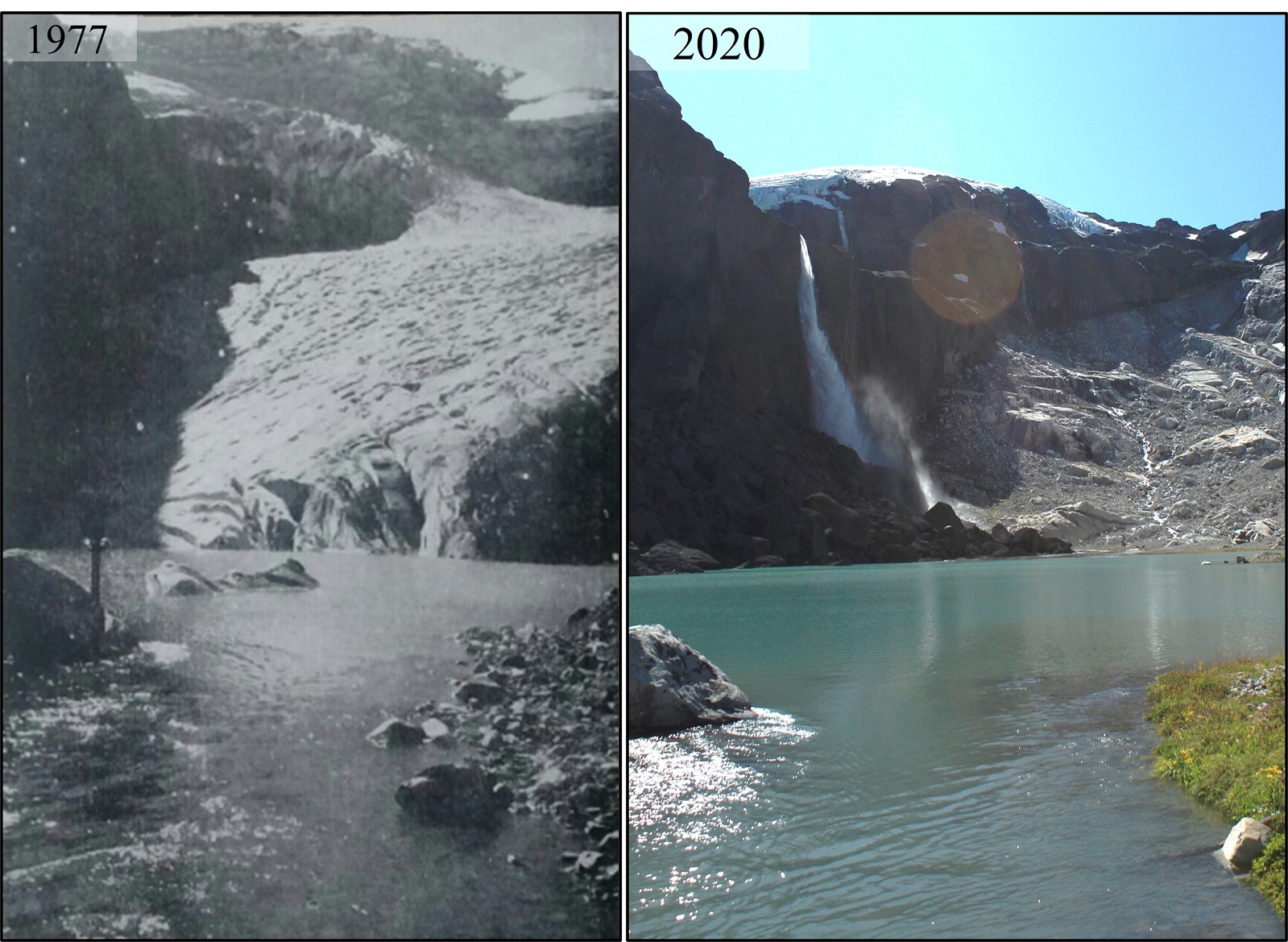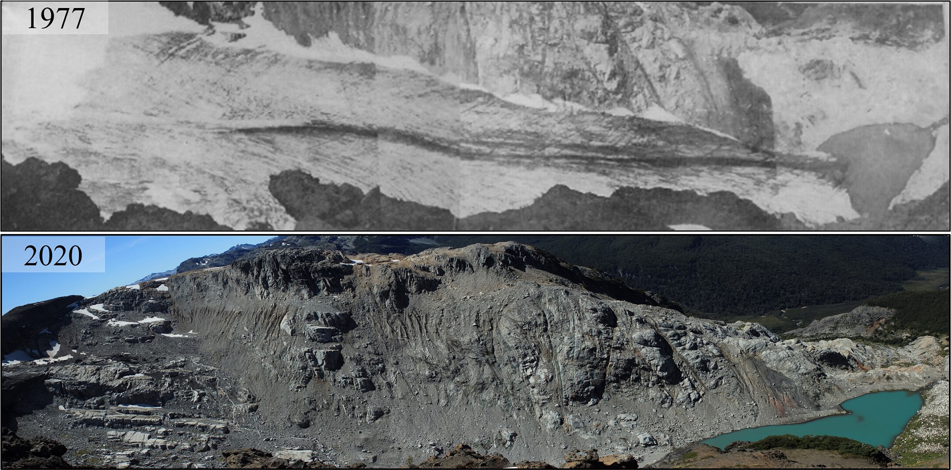 Se replicaron las fotografías históricas del frente del glaciar publicadas en Rabassa et al. (1978). En la figura 4, se observa la comparación del frente del Alerce para el año 1977 y el año 2020, tomadas desde la naciente del río homónimo. Es posible observar que en 1977 el glaciar formaba una lengua de hielo que descendía por el valle hasta el lago, mientras que en el año 2020 el frente se ubica en el filo del acantilado. Desde una vista lateral (Fig. 5) el cambio en la extensión del glaciar es más evidente.