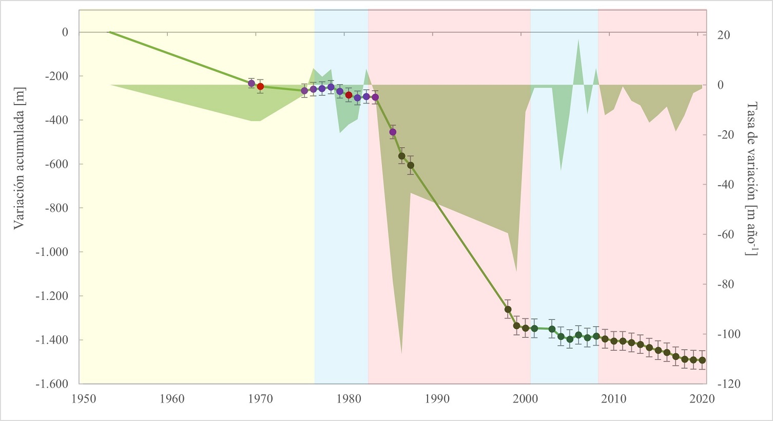 Los cambios en el área y la posición del frente evidencian un marcado retroceso entre 1953 y 2020. El glaciar perdió un 1,1±0,1 km2 de su superficie (35%) y alcanzó un retroceso acumulado de 1.492±40 m (67%). A su vez, fue posible distinguir diferentes patrones de cambio a lo largo del tiempo. En primera instancia se observa una etapa de retroceso (1953-1976), seguida de un período de estabilidad (1977-1983), luego un retroceso mayor (1984-1999), otro período estable (2000-2009), y finalmente un nuevo período de retroceso hasta el año 2020. Sus tasas de retroceso coinciden con las observadas en otros glaciares de la región, lo cual puede representar una señal climática regional.
