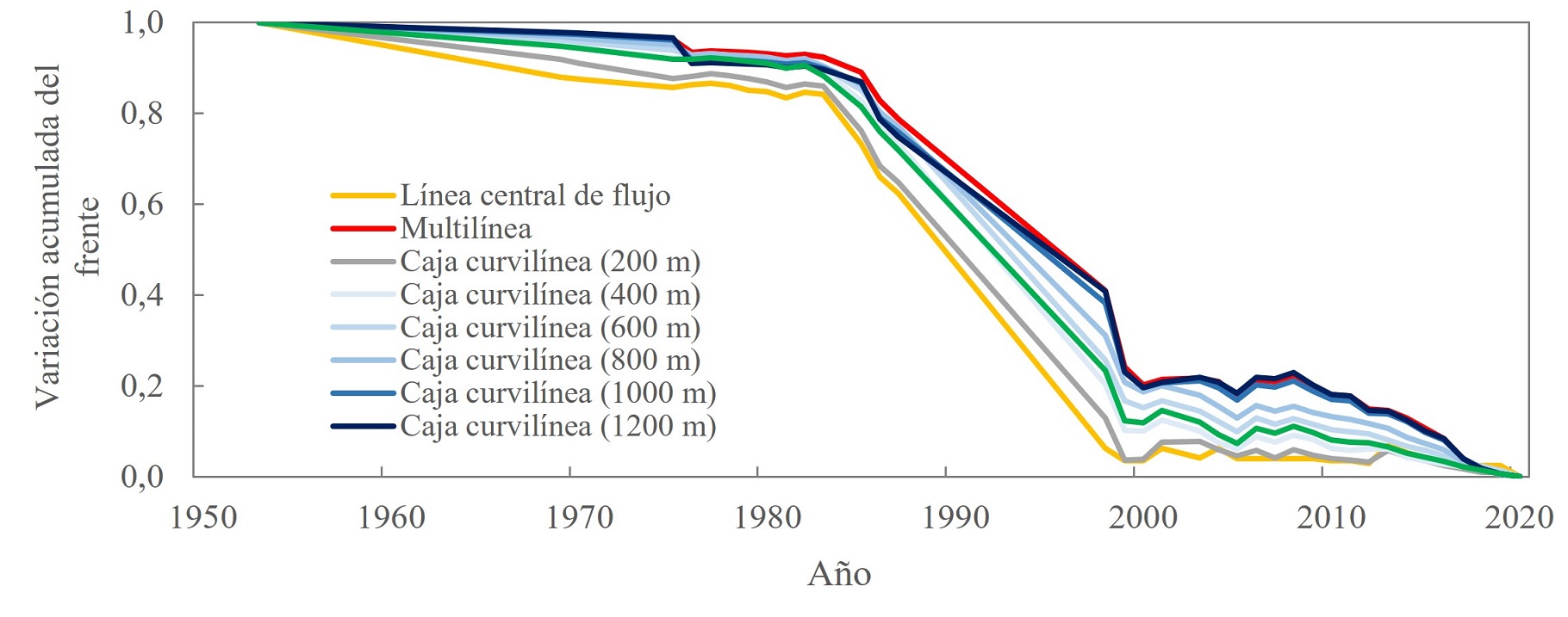 Analizando los cambios de longitud según diversas metodologías (ver sección 3.4) se encuentran diferencias significativas (Figs. 9 y 10). La mayor de ellas está entre los métodos de caja variable y de multilínea (variación acumulada >640 m), donde para el primer método se obtiene una tasa media de retroceso ~2 veces mayor comparada con el segundo.