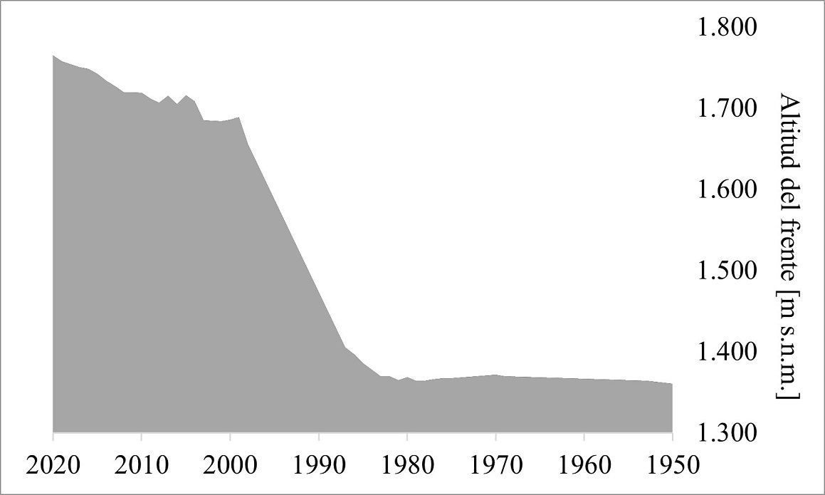 Desde el año 1953 hasta el año 2020, el glaciar Alerce perdió el 35% de su superficie y un 67% de su longitud total. Su retracción fue más acentuada durante las décadas de 1980 y 1990, cuando el frente atravesaba una zona de alta pendiente (Fig. 13). Durante estas dos décadas el frente ascendió ~320 m, lo cual representa el 79% de variación altitudinal total.