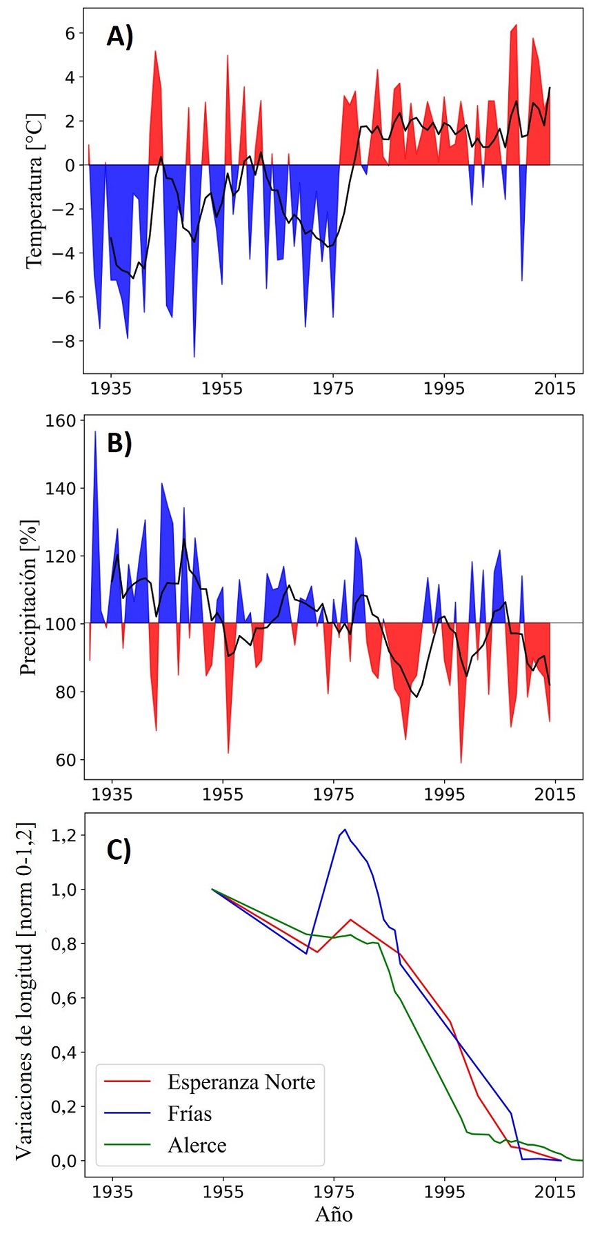 En Patagonia norte, las series de variaciones de longitud y área de los glaciares Frías (41,16° S, 71,83° O) y Esperanza Norte (42,13° S, 72,15° O) (Fig. 1A) son de las más extensas y detalladas de los Andes. Ambos exhiben un patrón similar de variaciones de longitud y área; tienen su máxima extensión en la Pequeña Edad de Hielo (~1650), un pequeño reavance entre los años 1970 y 1976, y un fuerte retroceso hacia finales de la década de 1980, seguido por una desaceleración en los últimos años (Leclercq et al., 2012; Ruiz et al., 2012).