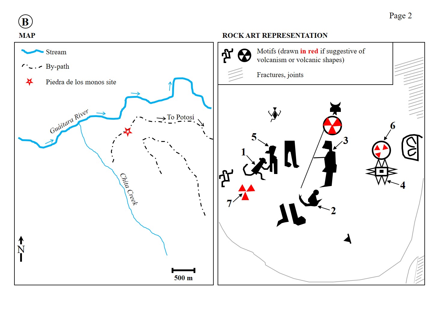 Despite the aforementioned ideas, the example presented in figure 5 strongly suggests a relationship with volcanism that goes beyond any speculation derived from our ethnocentric view. Although the Quechuan toponymy of Urcunina, one of the most recent volcanoes of the Galeras Volcanic Complex and the older indigenous name given to the younger Galeras Volcano, translates as “mountain of fire” or “mountain that spews fire”; in the indigenous thinking of the region the volcano does not exist as a fire, earthquake, and ash-producing phenomenon, but as high place inhabited by spirits where earth and water are periodically produced. In this way, the representation of water, or the high place, or that of a magical being is also a depiction of the volcanic phenomenon, which could also be represented by anthropomorphic figures like the ones included in the El Higuerón pictograph, Piedra de Guagua Rayo petroglyph or the Mantel de Piedra petroglyph. Another consideration is that most of the motifs are abstract, at least those in the rock art sites closer to volcanoes. Although there is great difficulty in recognizing on rock art the clear manifestation of volcanoes or volcanic activity, surely volcanoes represent a sacred entity because of their relationship to the origin myths, to the presence of pre-Columbian burial places around volcanoes, and to evidence of cosmic (spirals, stars, the sun), humanoid and exotic (monkeys) designs on near-volcano rock art representations.