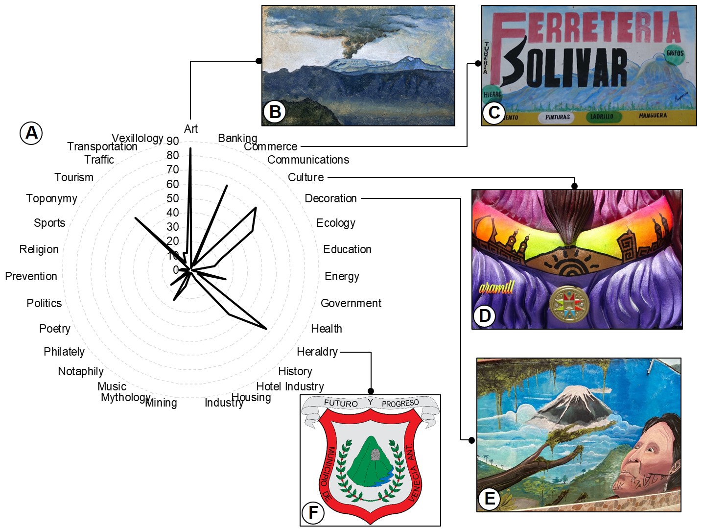 FIG. 3. A. Circular line-graph showing the number of observed occurrences of modern volcanic depictions (2018-2023) in Colombia, classified according to their context (Sánchez and Calvache, 2018; Calvache and Sánchez, 2022), with some examples. B. Art (watercolor on paper of the Nevado del Ruiz Volcanic Complex). C. Commerce (advertisement for a hardware store with the Cumbal Volcanic Complex in the background). D. Culture (fragment of a float built for the 2020 Negros y Blancos carnival in Pasto, Nariño, with Galeras volcano in eruption). E. Decoration (mural with snow-capped Nevado del Tolima volcano). F. Heraldry (coat of arms of the Venecia municipality, Antioquia, with monogenetic volcano Cerro Tusa). See Supplementary material 1 for details on all depictions reported.