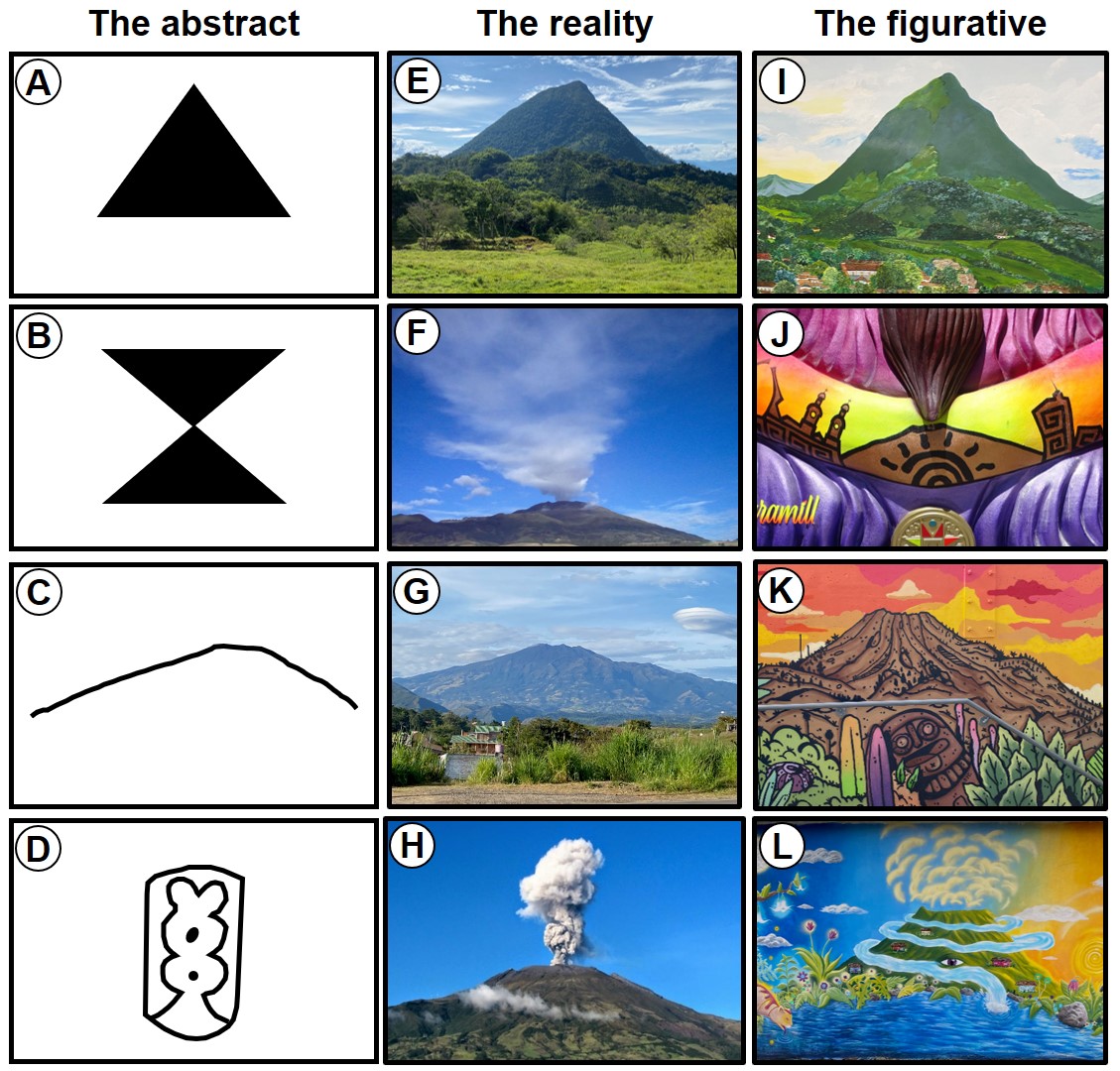 Regarding the time character of depictions, rock art lasts longer (several millennia?) as opposed to the relatively short life span of modern representations. Older depictions focused on the abstract and the symbolic, and it is difficult to assess their purpose or their use, as opposed to the modern cases. By analyzing the outlines of modern depictions (Fig. 4; Supplementary material 1), however, we find some possible linking traits to the older cases, namely the use of simple shapes like triangles, broken or zigzag lines, arched lines (see, for example, Cruz and Yaqueno, 2023), that in the past may have also been intended to depict volcanism. That simple motifs like triangles or arched lines were used by the ancestral inhabitants as symbolic depictions of volcanoes makes sense if we consider the conditions under which they were produced: primitive tools, slippery and steep rocky surfaces, and basic materials; conditions that required simplicity in the etchings and drawings. Geometric shapes represent better the connectivity and balance that persist in the indigenous thinking (López, 2014). Whether the designs left on rocks were intended to represent volcanism remains as an open question, because visual design is characterized by its intentionality, but it may be oriented towards the aesthetic, the semantics, or other ends (Leroi-Gourhan, 1971). Also, the identification of the link between a pictograph or petroglyph maker and the reality they lived in is a complex process because the relationship among aesthetics, design, and the environment or the society is multidimensional (Duncan, 1992).