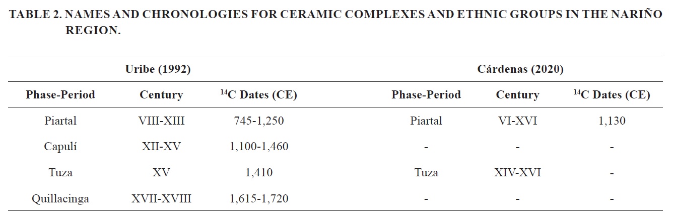 If indeed the motif in El Higuerón pictograph represented the volcano with some activity, the timing of these rock art examples is relevant as well. The pictographs are located within the territories previously occupied by the Quillacingas (El Higuerón) and the Pastos (Piedra de Los Monos), descendants of the Protopastos people whose chronology has been situated between ~1,000 and 1,500 CE (Uribe and Cabrera, 1988; Tapia, 2006). Archaeological research in the Carchi Province (northern Ecuador) (Uhle, 1933; Grijalva, 1937; Jijón y Caamaño; 1951)2 established three ceramic-style groups: Capulí, Piartal, and Tuza (Francisco, 1969). In Colombia, more recent works kept the same ceramic-based names for the archaeological groups (Cardale, 1978; Plazas, 1978; Uribe, 1978; Uribe and Lleras, 1983; Groot and Hooykaas, 1991). The chronologies for these archaeological groups have been revised with 14C dating of various materials found associated to ceramics (Uribe, 1992; Cárdenas, 2020). A summary is presented in table 2.