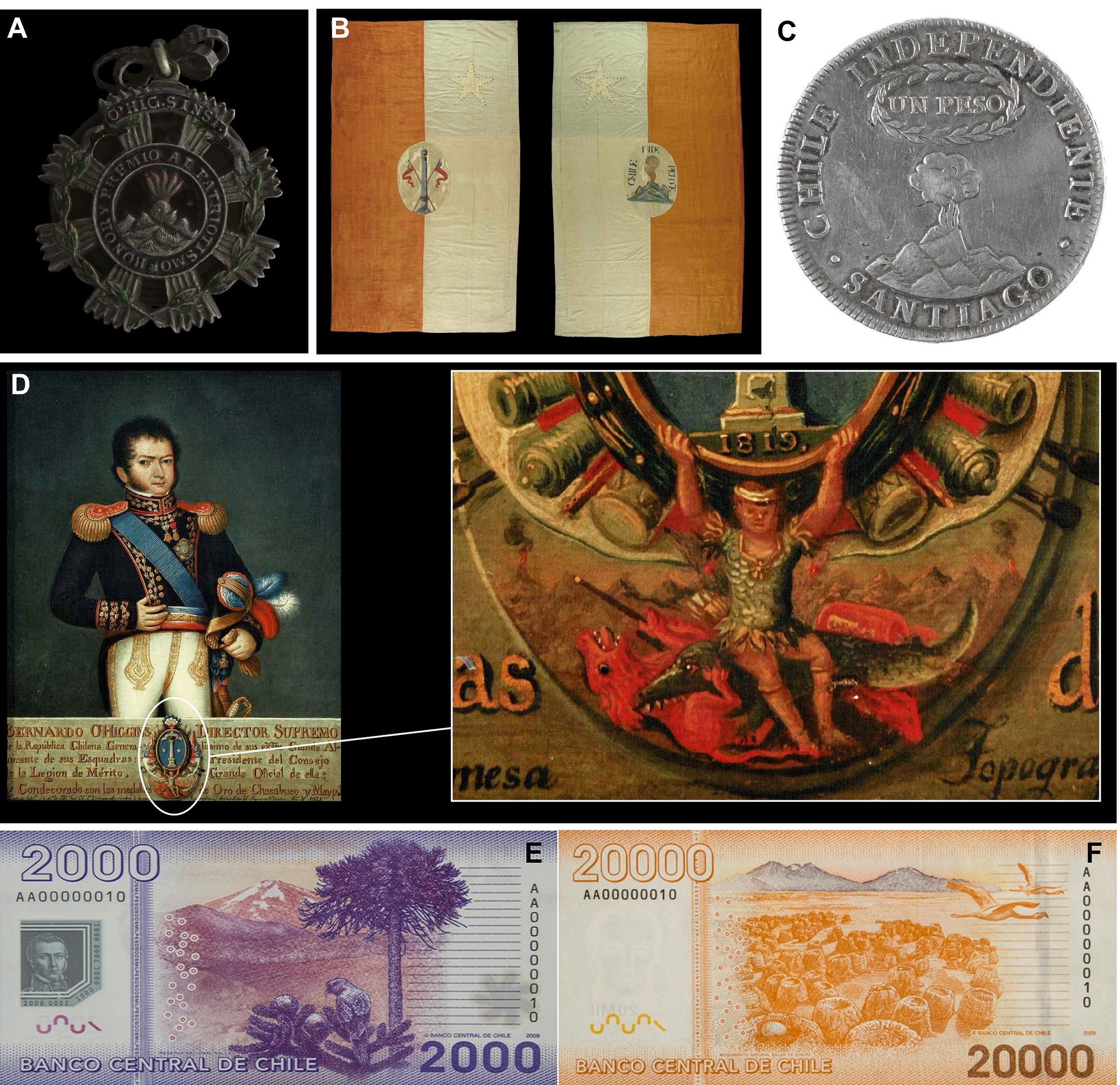 In the same period, the Chilean coat of arms, which preceded the current one, was created after the independence of Chile by order of Bernardo O’Higgins, the former Supreme Director. This coat of arms was official between 1819 and 1834, and included the volcanic arc, with several volcanoes erupting simultaneously (Fig. 1D). The chain of volcanoes on the coat of arms represented the pillanes, spirits of ancient political and spiritual authorities who, according to Mapuche worldview, live inside volcanoes (MNBA, 20192). Among the various elements that represent the strength and freedom of the Chilean people and the Chilean territory, it is also possible to find symbols of military and civil power. Ignacio Andía y Varela (1757-1822), for example, engraved this coat of arms in wood in the front of the Palace of Independence (now the National History Museum). He added an indigenous person representing Chile sitting on an alligator that is biting a dragon, a scene symbolizing the Americas eating the Lion of Castilla (Cartes Montory, 2013). The coat of arms appears in an 1821 portrait of Bernardo O’Higgins by the famous Peruvian painter José Gil de Castro (1785-1841) (Fig. 1D).