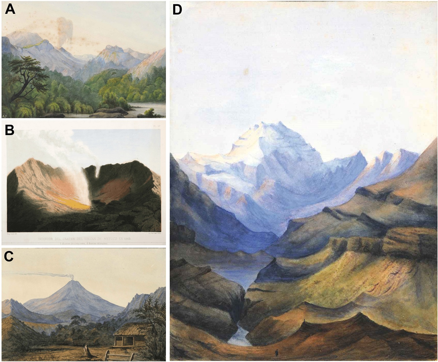 From a broader context, and in order to make more visible, meaningful, and predictable relationships between social life and volcanic processes, we have to navigate in one interface where both volcanoes and society are present: the arts. To investigate this question, we ask ourselves whether or not this capacity of the arts was truncated with the constitution of modernity, since we are aware of the importance of arts in observing and communicating environmental phenomena since prehistoric times, as demonstrated by art rock and oral memory (e.g., Grebe et al., 1972; Isasmendi and López Campeny, 2022) or later with examples from early modern science, such as the illustrations of volcanoes and volcanic eruptions by William Hamilton in Campi Flegrei and Alexander von Humboldt in Chimborazo.
