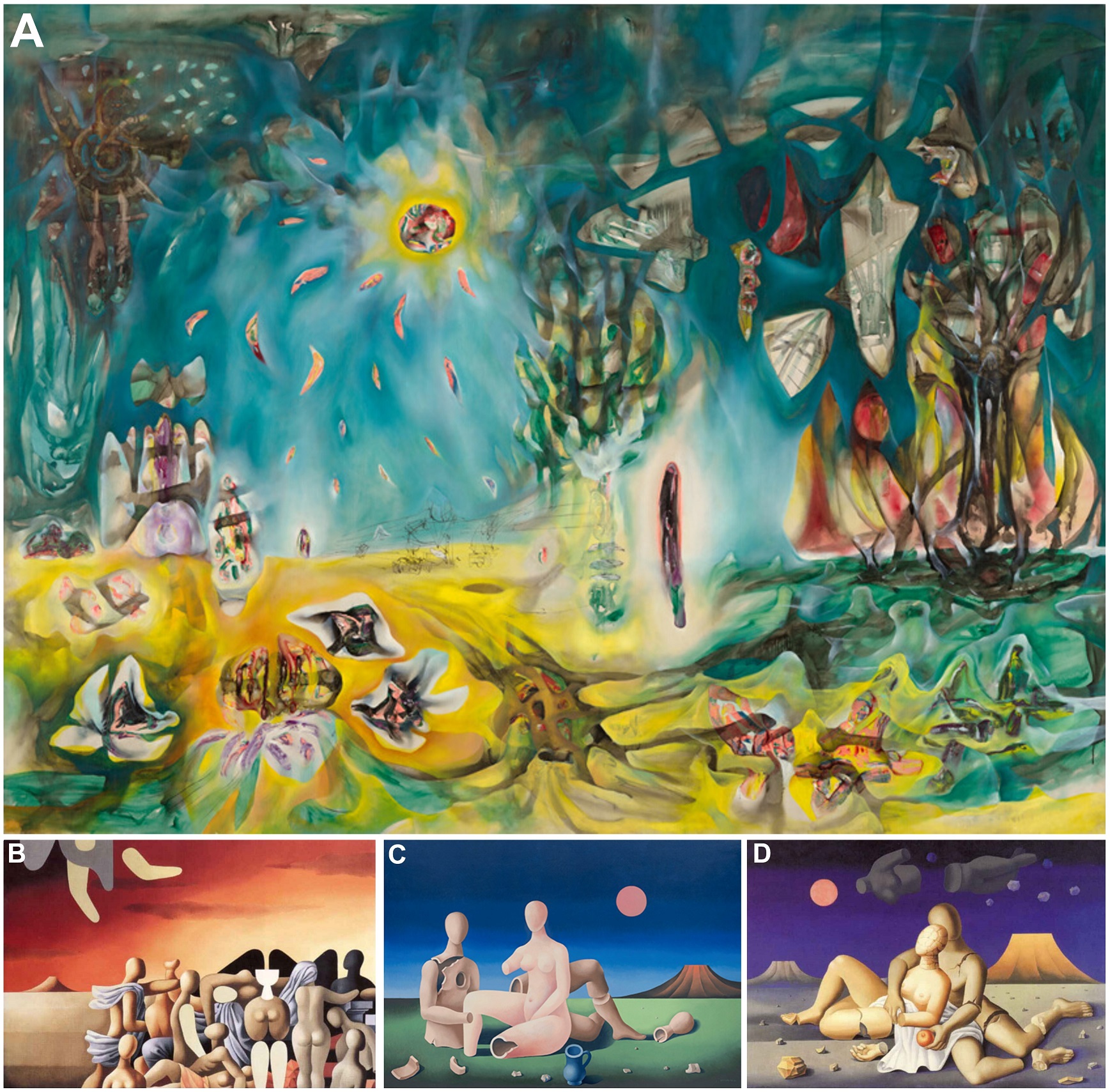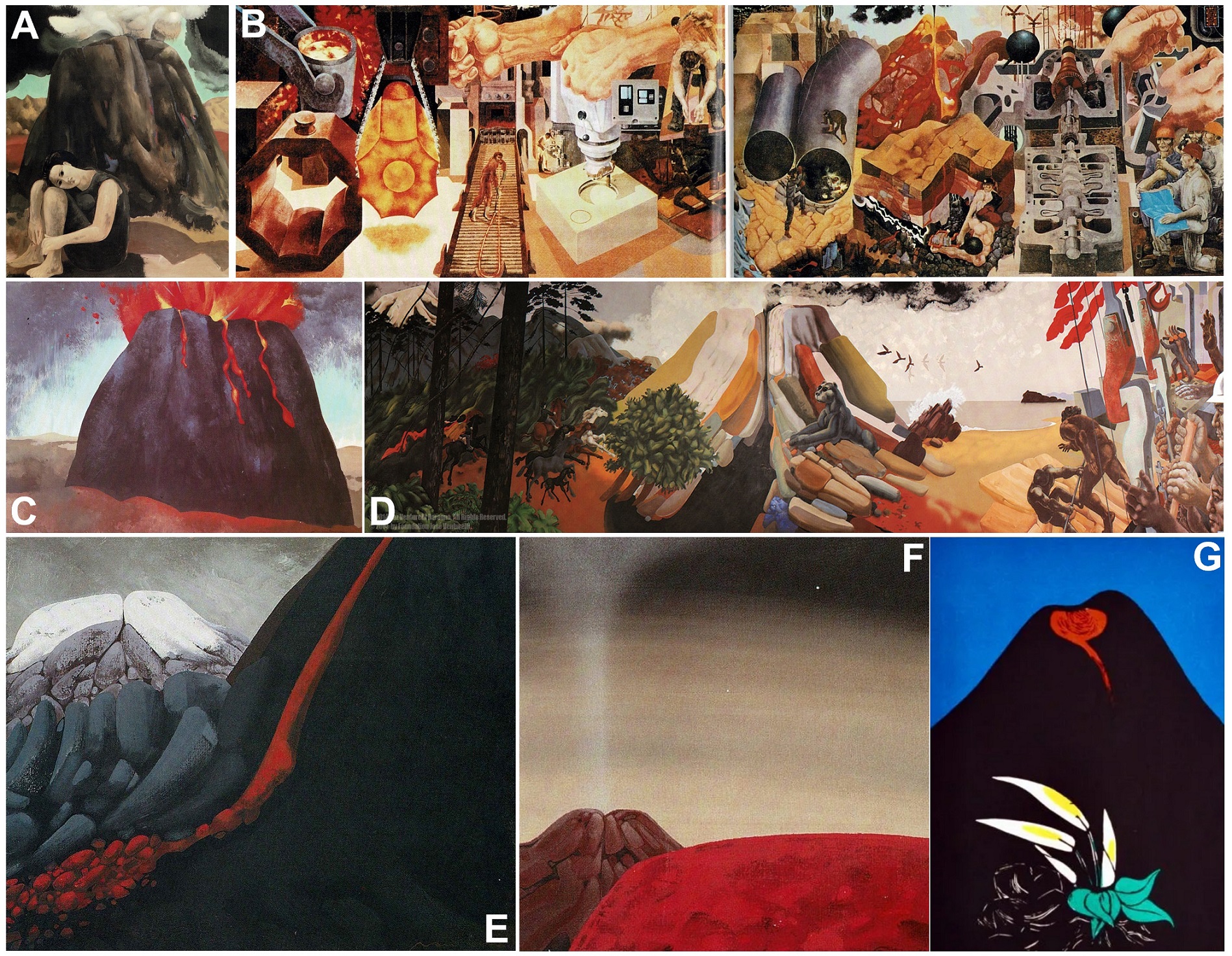 Matta’s paintings of volcanoes, including La Tierra es un hombre (The Earth is a Man) (1942), present the viewer with surrealistic images that broke away from traditional artistic language (Fig. 5A), an encounter between humans and the cosmos as the main imaginary act, as he pointed out: ‘we are led to believe that the real is seen through a window. One is here and the real is there; this deformation has been transferred to painting. But we are at the center of what is happening: from above, from the front, from the right, from the left, from below, from behind, reality bombards us. To be in four dimensions it is necessary to perform an imaginary act, like that of perspective, which consists in perceiving the events that are at the center of the scene’ (Matta, 1991). It is believed that Matta wanted to evoke sensations and images related to the birth of Paricutín volcano (Vargas, 20113), whose activity began with precursory earthquakes in 1941 and started to form the volcanic edifice in 1943 (Yokoyama and De la Cruz-Reyna, 1990), such as those represented in Invasión Nocturna (Invasion of the Night) (1941), Escuchar vivir (Listen to living) (1941), Los Desastres del Misticismo (The Disasters of Mysticism) (1942), and Volcán en Erupción (Erupting volcano) (1951).