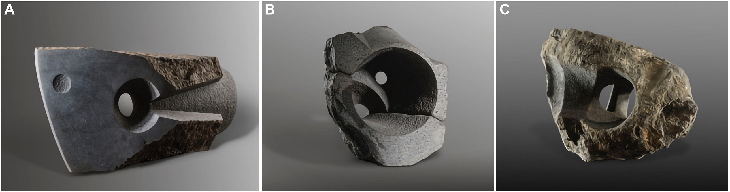 The works of Chilean sculptor Francisco Gazitúa Costabal (1944-) also stand out. He has explored the Andean volcanic universe on numerous occasions, not only from a symbolic perspective but also by utilizing materials derived from volcanic eruptions. Among his noteworthy works are those created in 2015, representing the Peruvian volcanoes Misti (Fig. 9A) and Hualca (Fig. 9B), as well as Maipo (Fig. 9C), the latter located across the Chile-Argentina border in Central Chile. Gazitúa also used volcanic rocks (basaltic andesites) from Tupungato, Maipo and San José volcanoes, all located near to Santiago, in his exhibition Viaje al corazón de la piedra (Journey to the heart of the Stone).