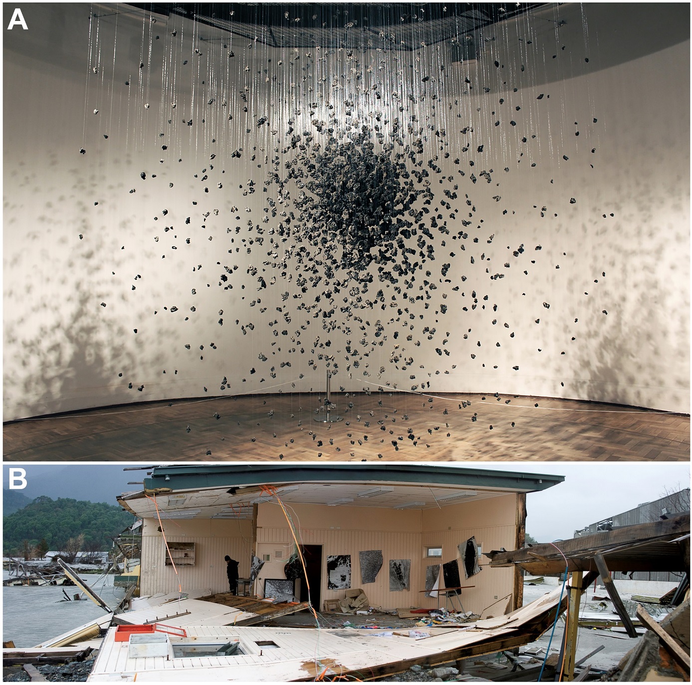 Finally, the artistic work of Fernando Prats (1967-) is focused on territory, geography, and landscape to reflect on its fractures and traumas. In this regard, his work pays special attention to disasters at different scales, such as volcanic eruptions, geyser bursts or earthquakes. His novel method is to recover traces left by the events. The artist does not intervene directly on the material components of the art piece but leaves climate and natural events to cast their imprints. This has to do with the idea of bringing back authority to matter and extracting from them the inner sense confined (Blanch, 2011). He first worked with dirty matter before moving on to hot matter, as illustrated by his installation Acción Chaitén (Chaitén action) (2009) which uses volcanic ash (Fig. 10B). Prat’s work recognizes the Earth, as a body that charges and discharges violent energies and whose tectonic liberations are accompanied by destruction. In that vein, his artistic work expresses the excess of the Earth where its surface is not a safe place because matter always overflows.