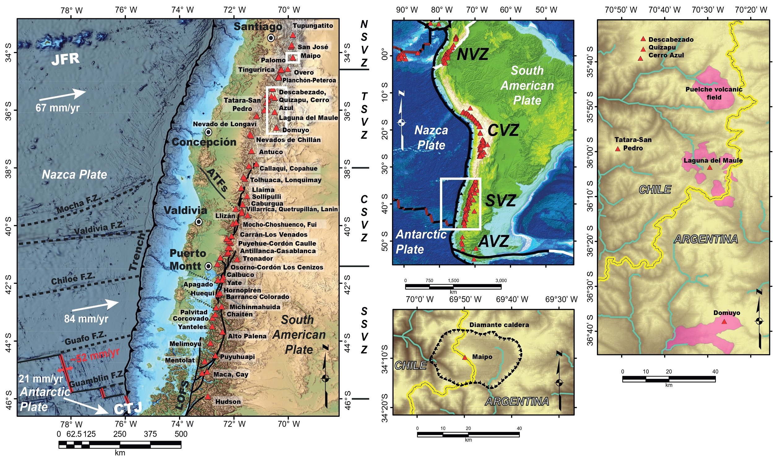 FIG. 1. Tectonic setting of the SVZ. A. Map of the SVZ, its active stratovolcanoes and volcanic complexes (red triangles). SVZ segmentation after Hickey-Vargas et al. (2016). The Liquiñe Ofqui Fault System (LOFS) and the major Andean Transversal Faults (ATFs) are also indicated. Thick black dotted solid lines in the Nazca plate represent fracture zones (Weller and Stern, 2018). Plate motion rates and azimuths (arrows) from Kendrick et al. (2003), DeMets et al. (2010), and Jia and Wei (2021). Base topography from ETOPO Global Relief Model-Bedrock 30 arcsecond hillshade (NOAA National Centers for Environmental Information, 2022)1. B. Close up of the Diamante caldera and Maipo volcano. C. Distribution of rhyolite-dominated volcanoes in the Transitional Southern Volcanic Zone, based in Hildreth et al. (1999, 2010) and Silva-Fragoso et al. (2021). The central, unlabelled map in the figure offers background tectonic information of the Andean volcanic arc and its active segments (Northern, NVZ; Central, CVZ; Southern, SVZ; and Austral, AVZ).