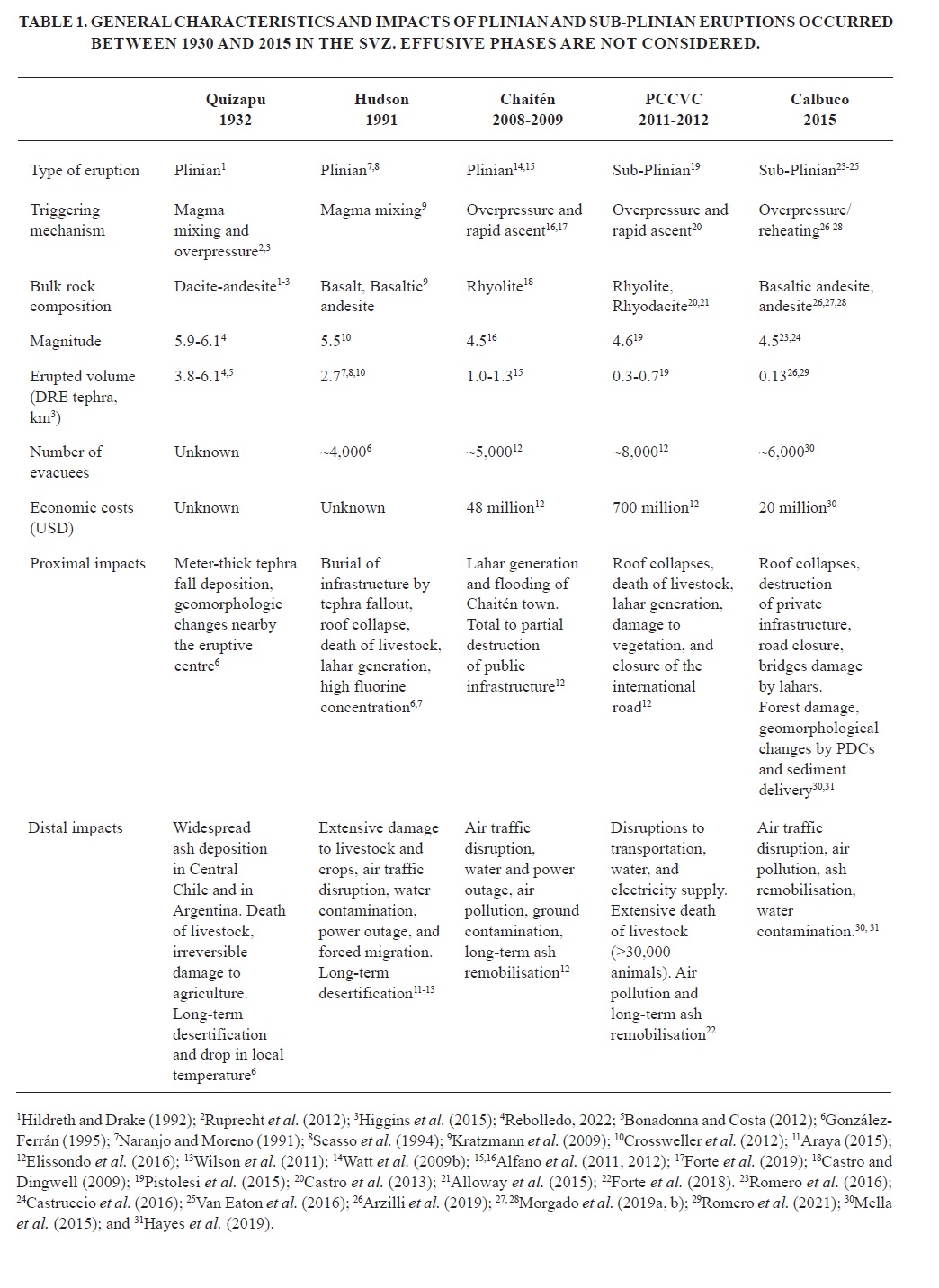 Tephra fall deposits are the most studied products from SVZ recent eruptions. Tephra dispersed and deposited during the Chaitén and PCCVC eruptions (Fig. 5D, E) caused extensive regional impacts and long-term episodes of ash remobilisation (Table 1; Martin et al., 2009; Bonadonna et al., 2015; Pistolesi et al., 2015; Elissondo et al., 2016; Forte et al., 2018; Domínguez et al., 2020). The 2015 Calbuco eruption produced heavy scoriaceous tephra (Romero et al., 2016) that caused roof collapses at proximal areas (Fig. 5F; Hayes et al., 2019). Although tephra deposited in Argentina during this eruption was ˂1 cm-thick, resuspension events exacerbated the impacts of primary fallout (Reckziegel et al., 2016). The erupted volumes of these eruptions (Table 1) are modest compared to the Quizapu 1932 and Hudson 1991 eruptions, whose tephra deposits blanketed the extra-Andean region and reached the Atlantic Ocean, affecting multiple countries (Hildreth and Drake, 1992; Naranjo et al., 1993; Scasso et al., 1994; Wilson et al., 2011). The Chaitén and Calbuco eruptions were accompanied by lahars with remarkable impacts on public and private property (Table 1; Fig. 5G, H).