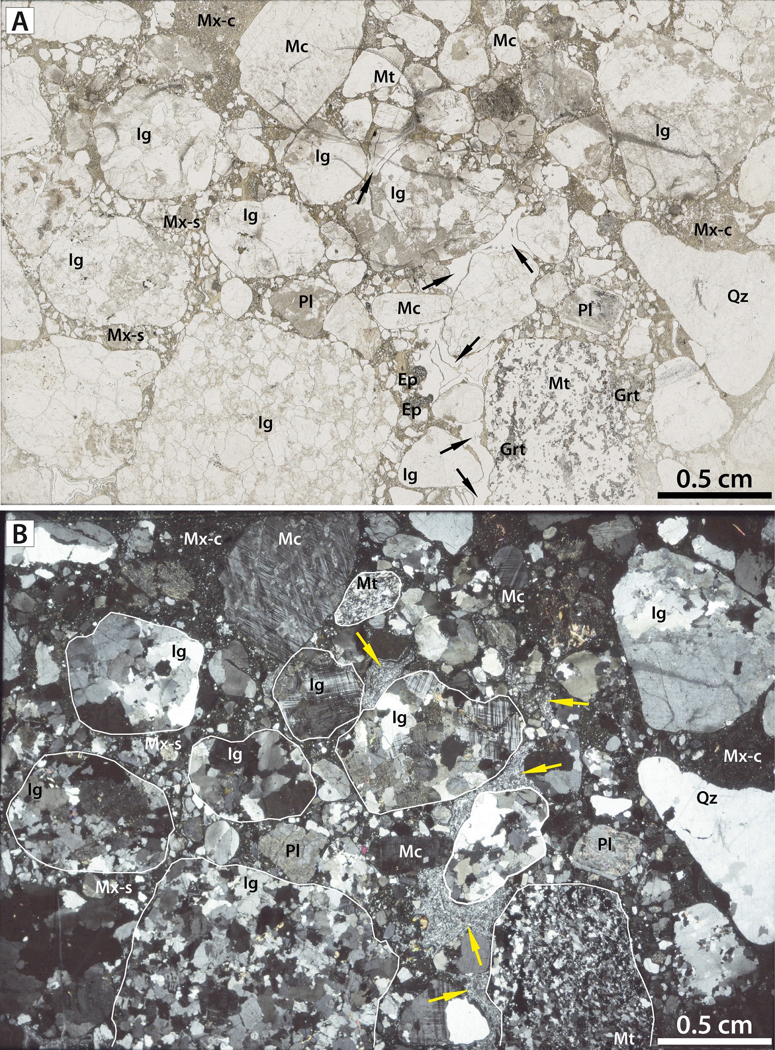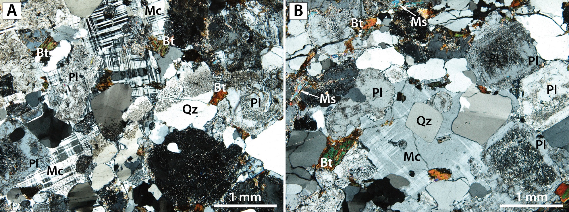 The grains in the conglomerates are mainly mineral fragments of plagioclase, microcline and quartz, and rock fragments containing these same minerals. The monocrystalline grains have similar or even greater sizes (up to 6.5 mm) than rock fragments (Figs. A1, A2, Appendix A). In the feldspathic lithic/arkosic arenites, the rock fragments are scarce. All these rocks also contain occasional grains of biotite, epidote, amphibole, titanite, muscovite, and opaque minerals. In addition to medium- to coarse-grained granitic fragments, such as those of the underlying basement, there are others consisting of fine- to medium-grained granitic rocks with equigranular, hypidiomorphic, porphyritic, or foliated textures; fragments of plagioclase+quartz+pyroxene partially replaced by amphibole, of uncertain origin, and fragments of metamorphic rocks (Fig. A2, Appendix A) made up of aggregates of stretched quartz±muscovite, and garnet-bearing metaquartzites.