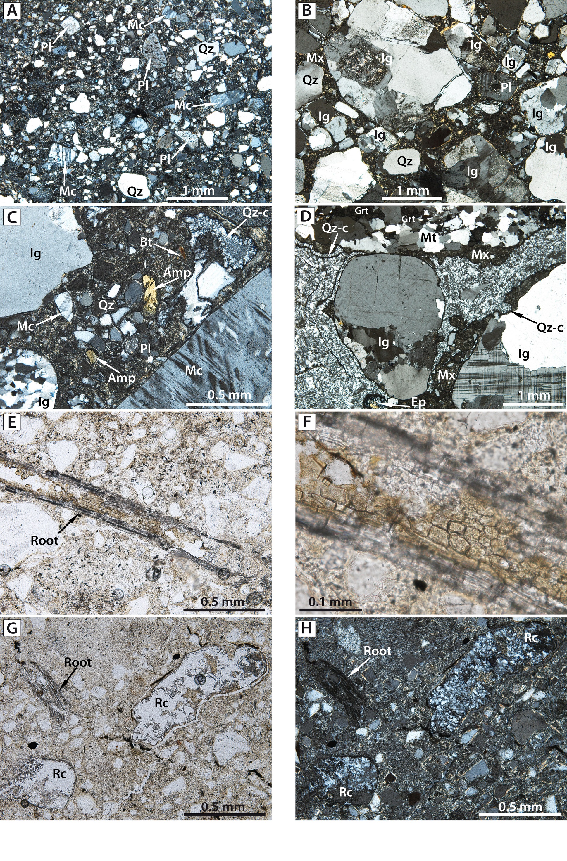 FIG. 6. Petrographic aspects of the Mercedes Formation at the Grutas del Palacio borehole. A. Poorly sorted feldspathic lithic/arkosic arenite with plagioclase (Pl), microcline (Mc), and quartz (Qz) grains. Sample C1-L. B. Poorly sorted granule-conglomerate, clast-supported or with scarce matrix (Mx) between grains (Pl, Qz) and igneous fragments (Ig). Sample H2-B. C. Pebble-conglomerate with a feldspathic lithic/arkosic arenite matrix and quartz-cement (Qz-c). Mineral grains in the matrix are Qz, Pl, Mc, amphibole (Amp), and biotite (Bt). Qz-c shows a microcrystalline core and a fibrous-radial rim. Sample G2-L. D. Another view of sample G2-L. Qz-c shows concentric fibrous-radial growths. Mt: garnet (Grt)-bearing metamorphic fragment, Ep: epidote. E-F. Another view of sample C1-L. Partially preserved plant root at different magnification scales. G-H. Another view of sample C1-L. Relict of a plant root and quartz-filled root casts (Rc). A-D and H: crossed polars; E-G: plane-polarized light. See figure 4 for location of the samples in the borehole. |