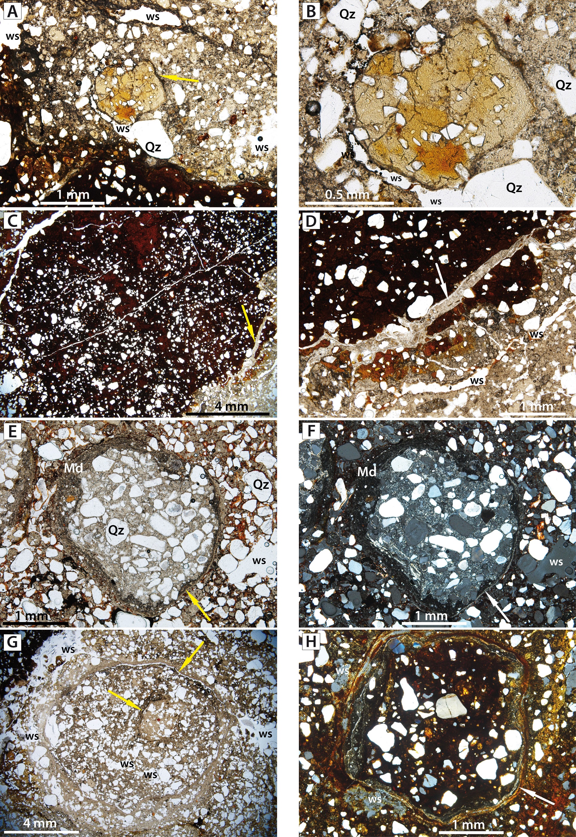 FIG. 7. Petrographic aspects of the Asencio Formation at the Grutas del Palacio borehole (ws: irregular areas without sample due to poor rock consolidation). A-B. Desiccation cracks in a mudstone fragment (arrow in A) embedded in a partially ferruginized, poorly sorted quartz (Qz) arenite, at different magnification scales. Sample B2-L. C-D. Fractures in a partially ferruginized, poorly sorted quartz arenite (white cracks), and fracture infilled by clay minerals (arrow in A). Sample B2-B. D. Detail of the infilled fracture shown in C, which crosses matrix-supported and iron-cemented areas. E-F. Typical appearance of the nodular forms surrounded by massive and laminated mudstones (Md) and infilled by quartz arenite. Arrow points out very fine, elongated clay minerals. Sample AS-3I. G. Complex cm-size nodule infilled by quartz arenite. Arrows point out nearly concentric laminated mudstone rims (note the semicircular fracture in the laminated outer rim). Sample B1-B. H. Ferruginized nodule and host quartz arenite. Arrow points out the laminated mudstone rim, which is also ferruginized. Sample B1-L. All photomicrographs in plane-polarized light, except F and H in crossed polars. See figure 4 for location of the samples in the borehole. |