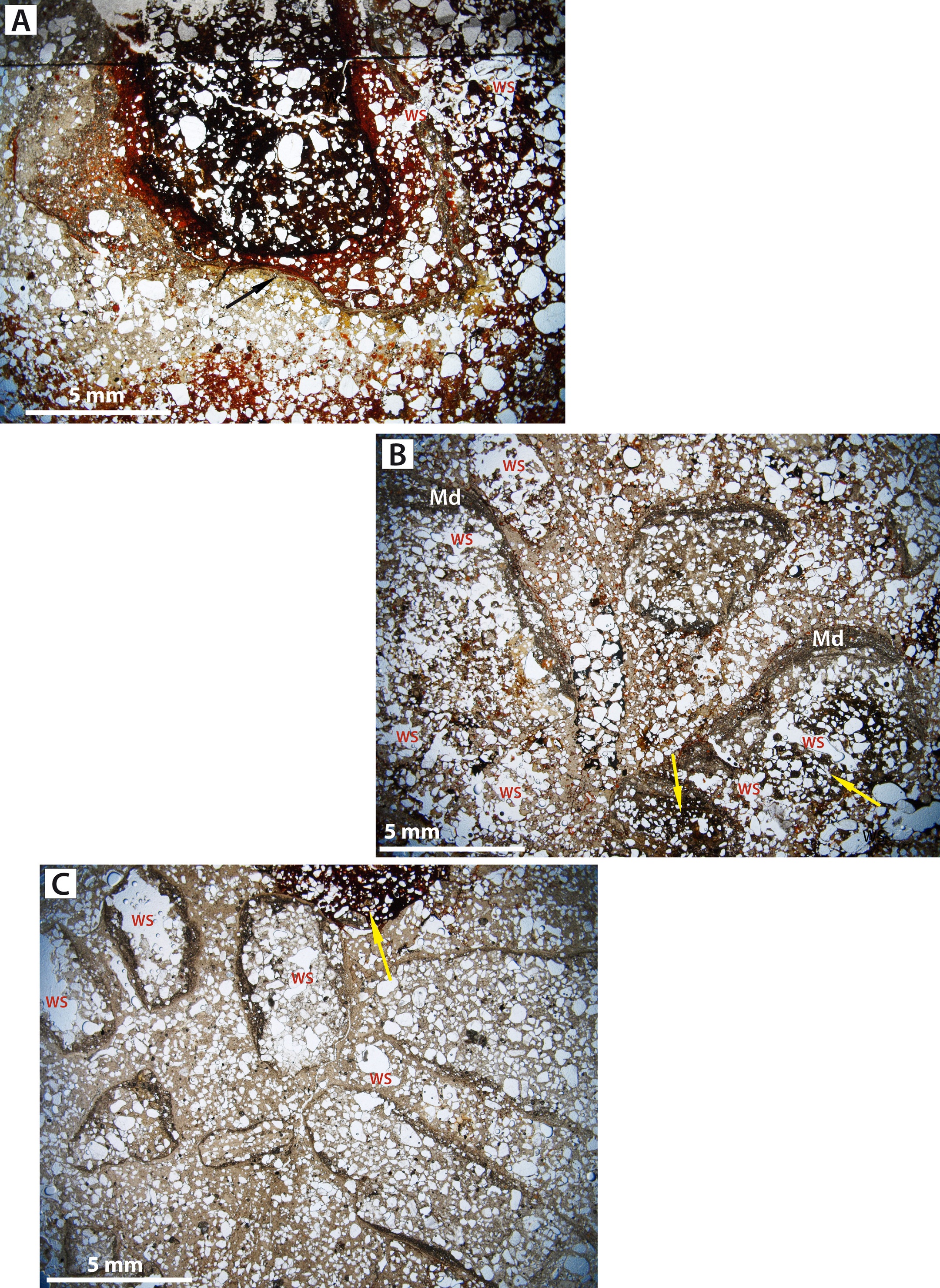 Petrographic aspects of the upper part of the Asencio Formation at the Grutas del Palacioborehole (ws: irregular areas without sample due to poor rock consolidation).