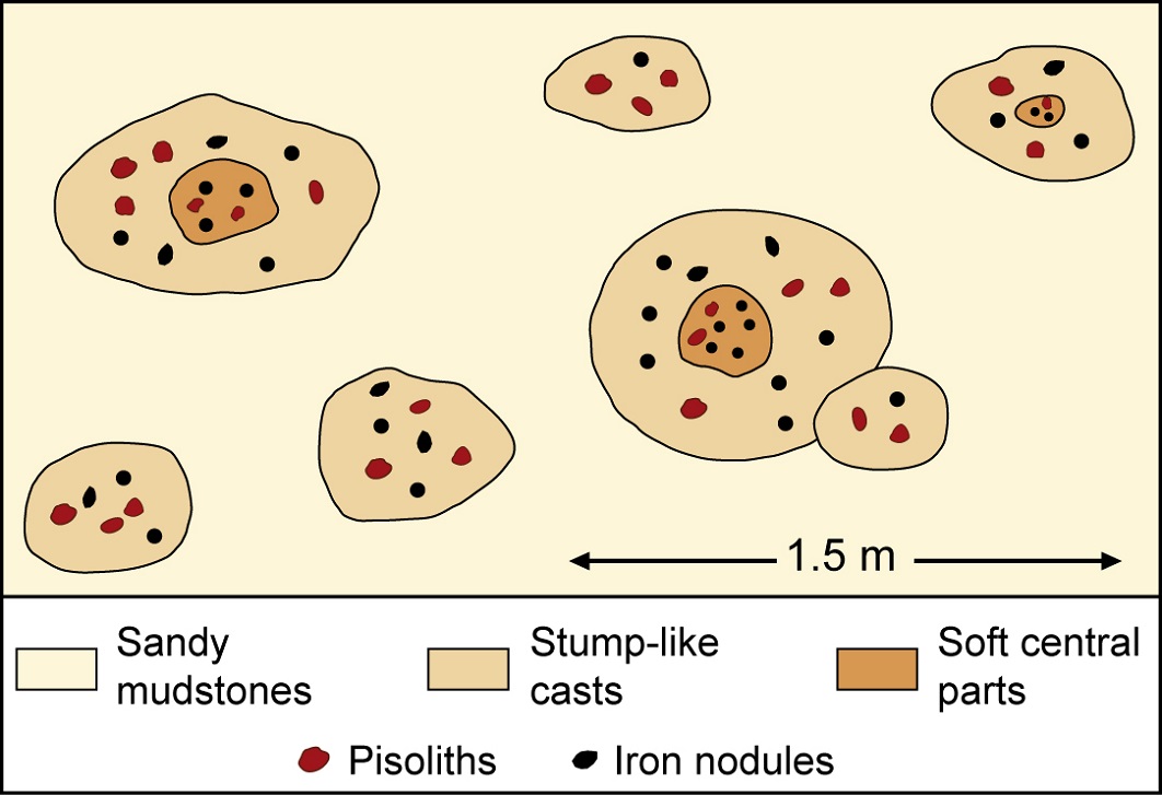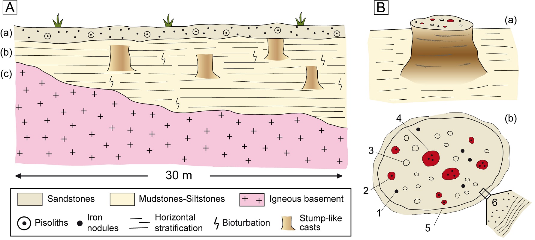 In this work, the deposition environment of the Palacio Member of the Asencio Formation is interpreted as a forest with large trees developed on terrigenous material. The forest was affected by sudden floods, which transported large amounts of mud and fine-grained silts by turbulent discharges. The inundation led to the destruction of the trees and a large mud accumulation. Ferruginized pisoliths and iron-rich soils developed because of the extreme weather conditions, e.g., intense and recurrent thunderstorms and droughts. These iron-rich materials were reworked and transported by erosional flows, infilling the stump casts, generating column-like structures. The recurrent nature of the floods allowed the preservation of these structures until present.