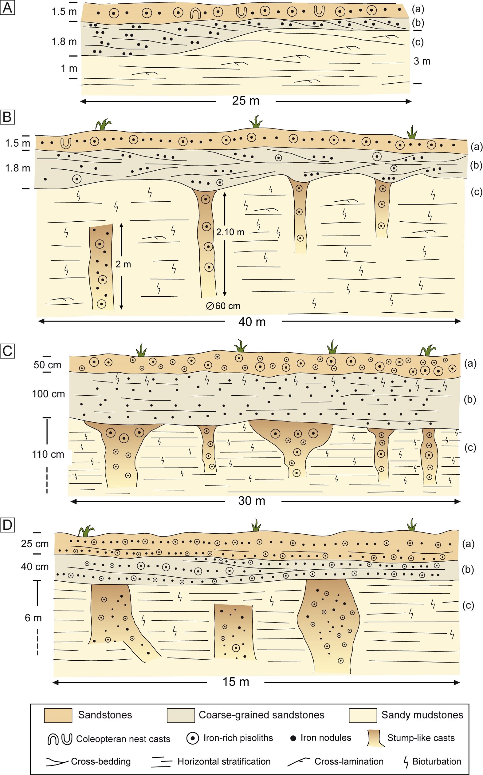 The caves and column-like structures were first described as trunk casts (Rivas, 1884). Benedetti (1887) also indicated their resemblance to tree stumps, while Isola (1900) suggested that the caves were man-made. Other authors interpreted the columns as a result of differential ferruginization of sedimentary deposits (Walther, 1931; Caorsi and Goñi, 1958), and as concretions formed by diagenetic processes and subsequent differential erosion (Pazos et al., 1998; Goso and Perea, 2003). According to Goso (1999) the columns represent large ferruginous concretions that were formed along fracture planes. Goso and Guérèquiz (2001) and Goso and Perea (2003) proposed that iron solutions, coming from a ferruginized upper level, were deposited concentrically in fracture planes or intersections in a lower clayish level, and that the subsequent vertical development of the concentric mottles gave rise to the columns. For Morrás et al. (2010) the columns are composed of ferruginous tongues and the caves would be the result of selective water erosion of the sandstones. Other authors interpreted the column-like structures either as large ferruginized paleorhizospheres (Genise et al., 2011), or as consequence of intense pedogenetic processes (Turner et al., 2017).
