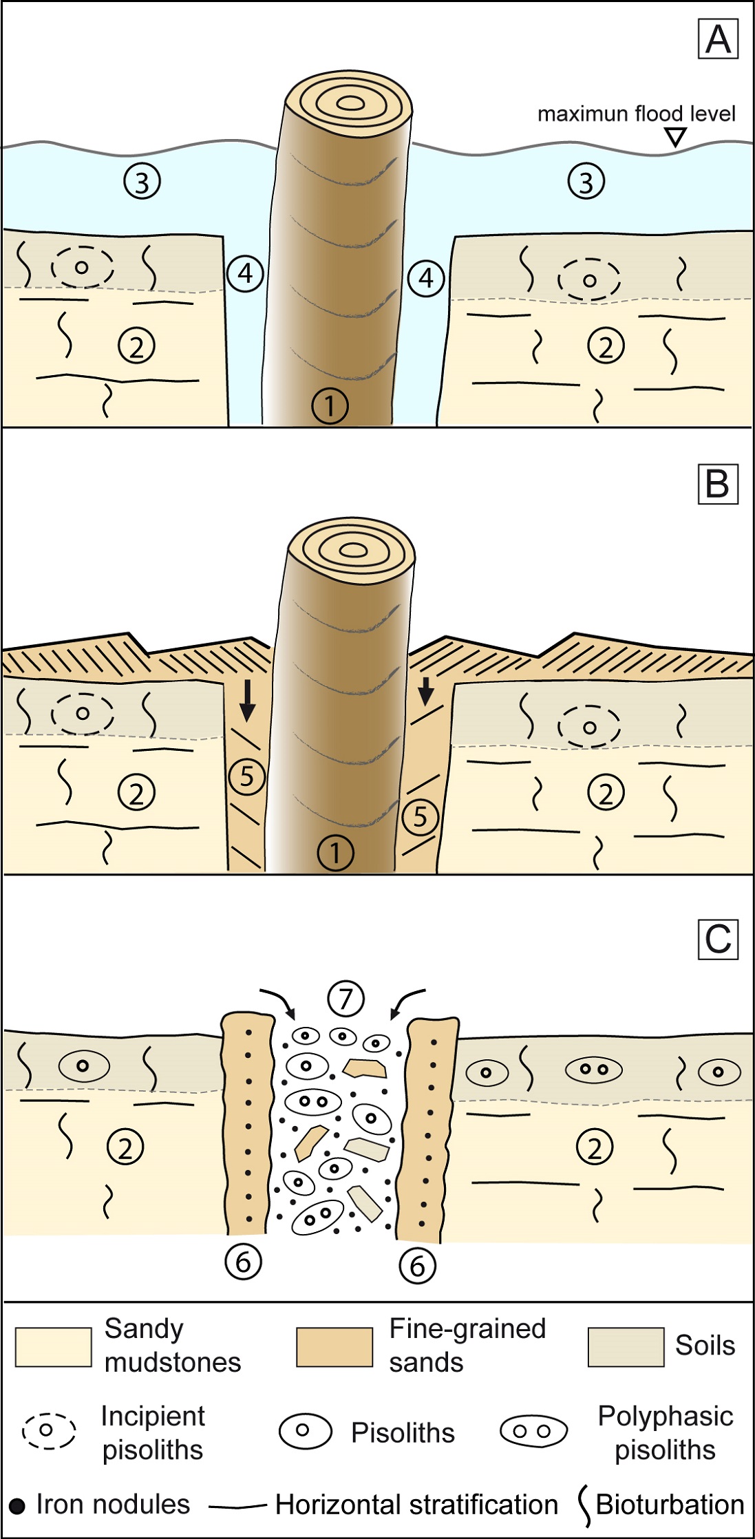 Although new interpretations on the origin of the column-like geoforms of the Asencio Formation have been proposed (e.g., Morrás et al., 2010; Alonso-Zarza et al., 2011; Genise et al., 2011; Turner et al., 2017), a clear and definitive explanation is not forthcoming yet. Some explanations for the ferrification episodes giving rise to pisoliths are available (Veroslavsky and Martínez, 1996; Martínez et al., 2001, 2015; Martínez and Veroslavsky, 2003; Kraus and Hasiotis, 2006; Tófalo and Morrás, 2009; Morrás et al., 2010; Tófalo and Pazos, 2010). Pisoliths associated with ferricretes probably had a pedogenetic origin in the paleosurface owing to soil development. After undergoing intense erosion, the pisolithic materials were probably reworked and accumulated in many voids. This suggests the column geoforms could have not been concretions because some columns display cross-sections marked by concentric rims (Fig. 9B), also described by other authors (e.g., Pazos et al., 1998; Goso and Guérèquiz, 2001; Genise et al., 2011). The vertical disposition of the column-like geoforms, their random areal distribution, and the presence of root-like casts at their basal parts (Fig. 7; Figs. B1, B2. Appendix B), allow us to assume that these geoforms were trunk casts. The reduced basal extent of the columns suggests that these developed from small roots near the base of the trunks. The column geoforms probably formed when the trunk casts underwent a sudden submergence (Fig. 16).